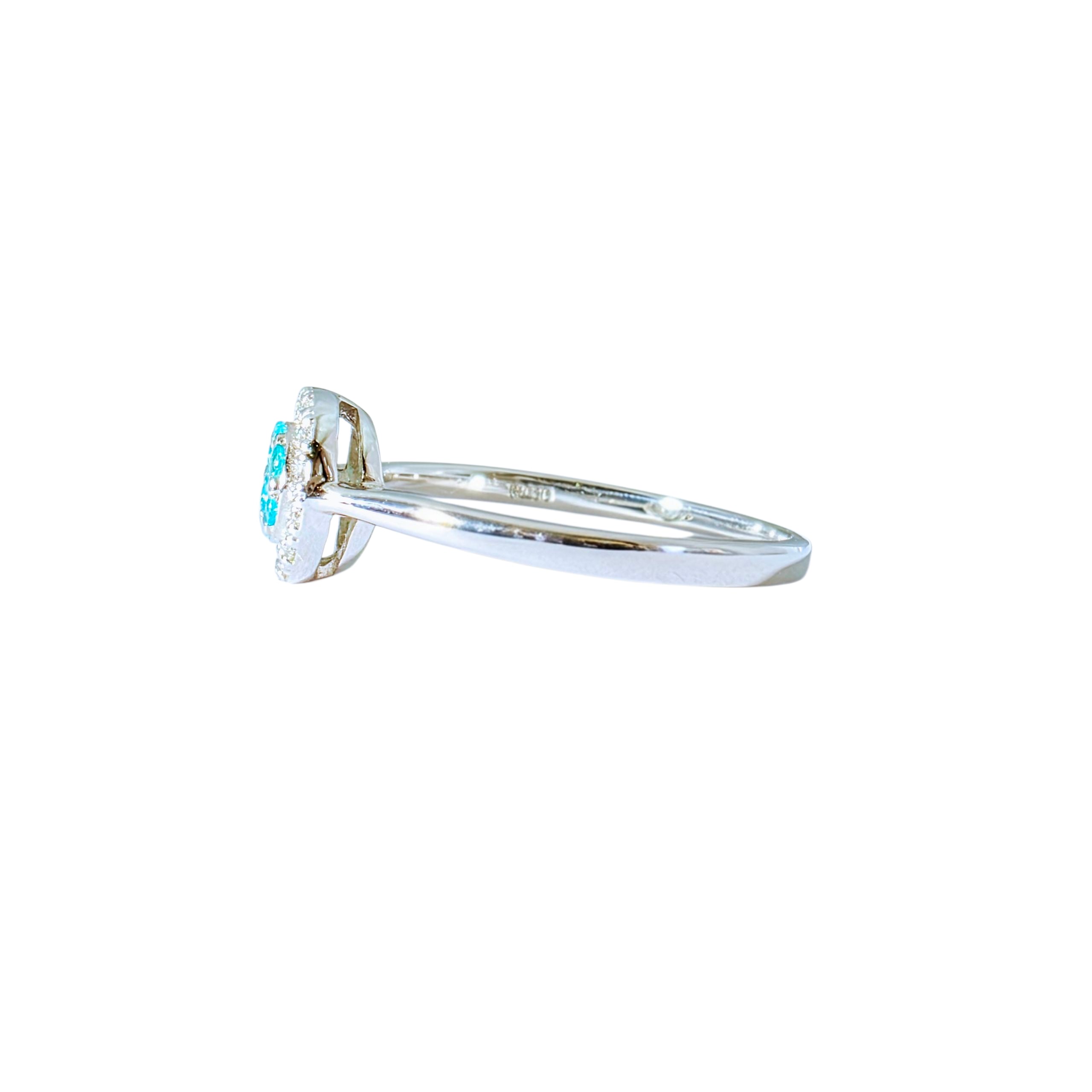 希少石として知られるパライバトルマリンを中央に配し、その周りを繊細なメレダイヤモンドで取り巻いた本作。