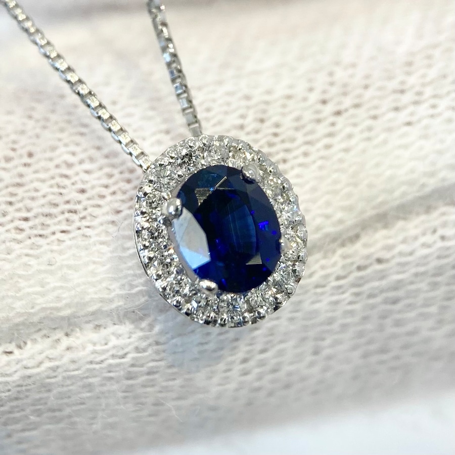 このペンダントは、そのロイヤルブルーサファイアをセンターに据え、繊細なダイヤモンドが周囲を囲む王道のデザイン。