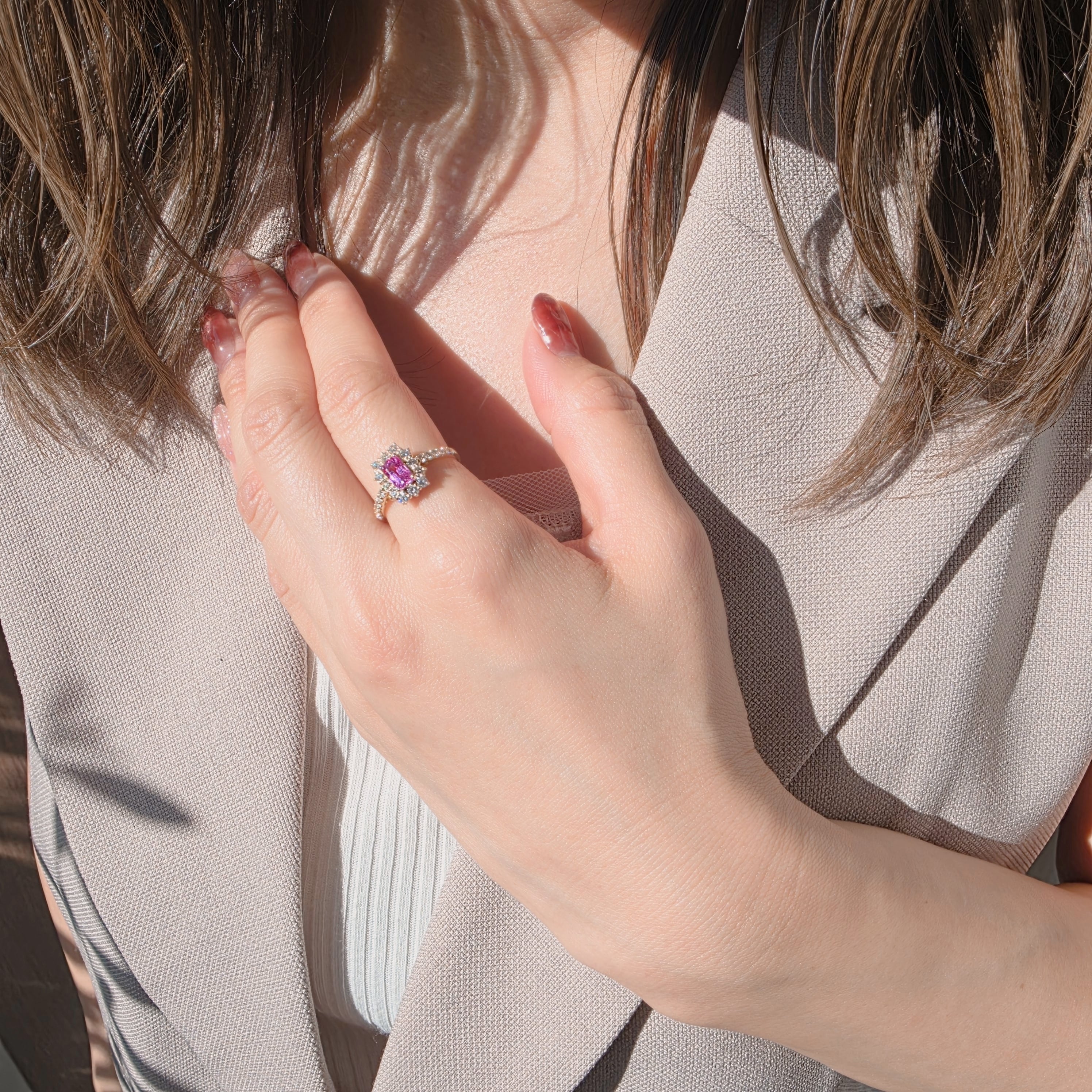 華やかなピンクサファイアを主役に据え、周囲を囲むダイヤモンドの輝きがその美しさを一層引き立てた本作。