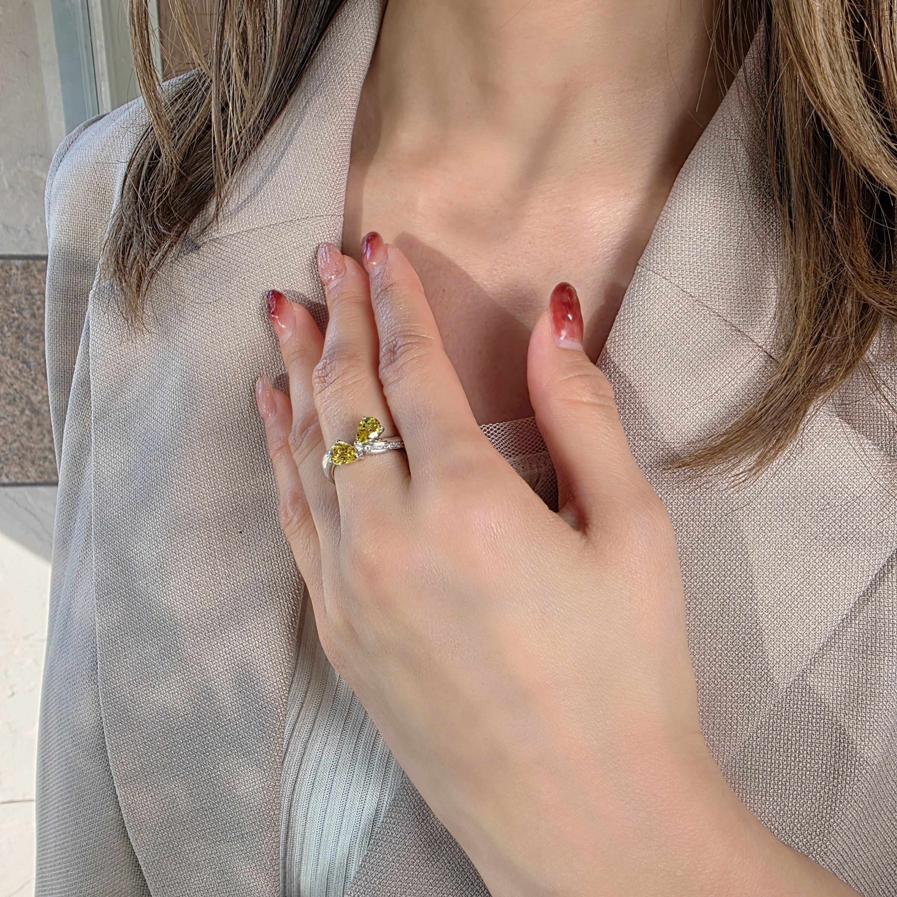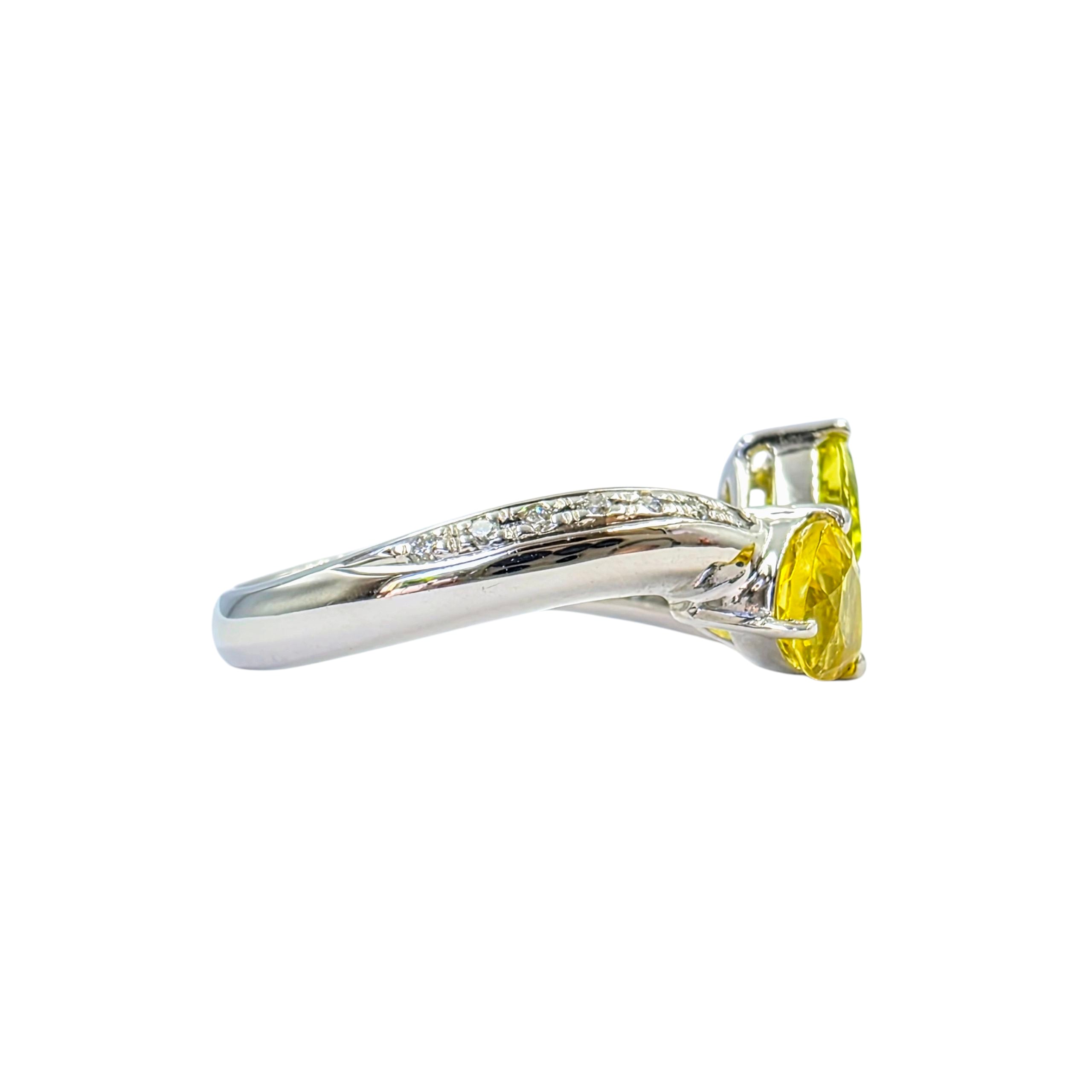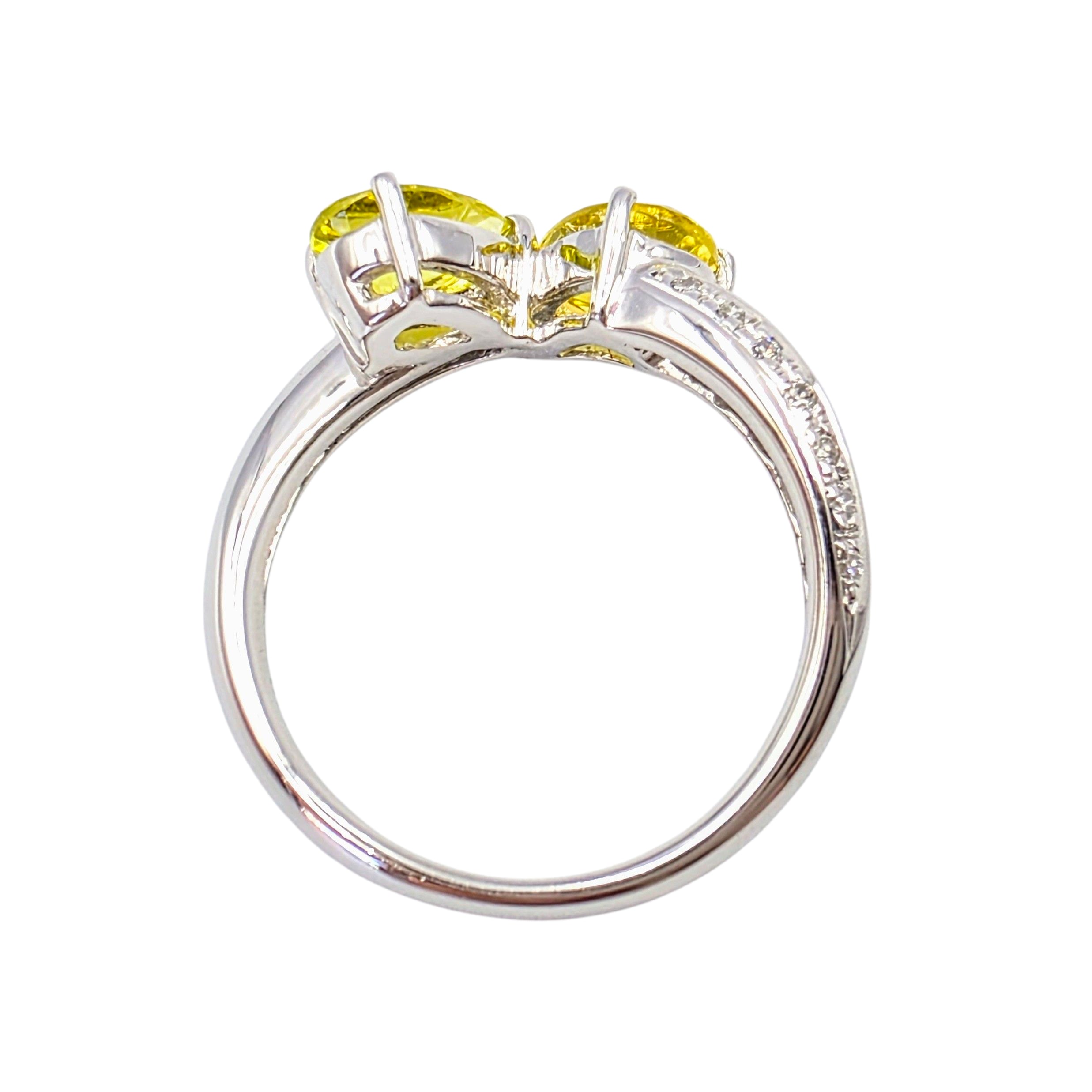 目を惹くビビッドなイエロートルマリンを2石セットした本作は、光を跳ね返すような輝きと個性的なフォルムが印象的。