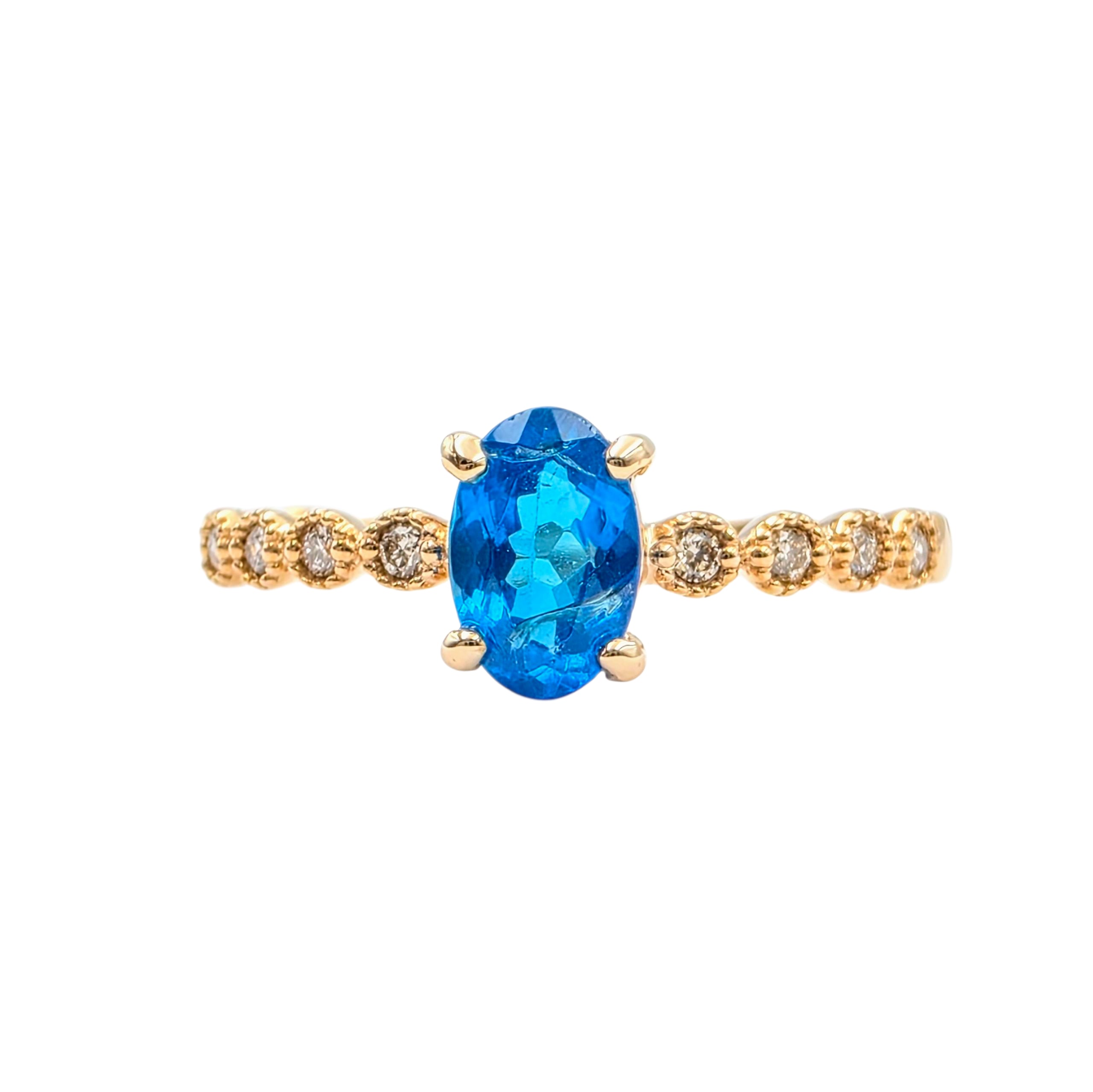 アパタイトの透明感あふれる鮮やかなブルーを、ピンクゴールドで柔らかく仕立てた本作。