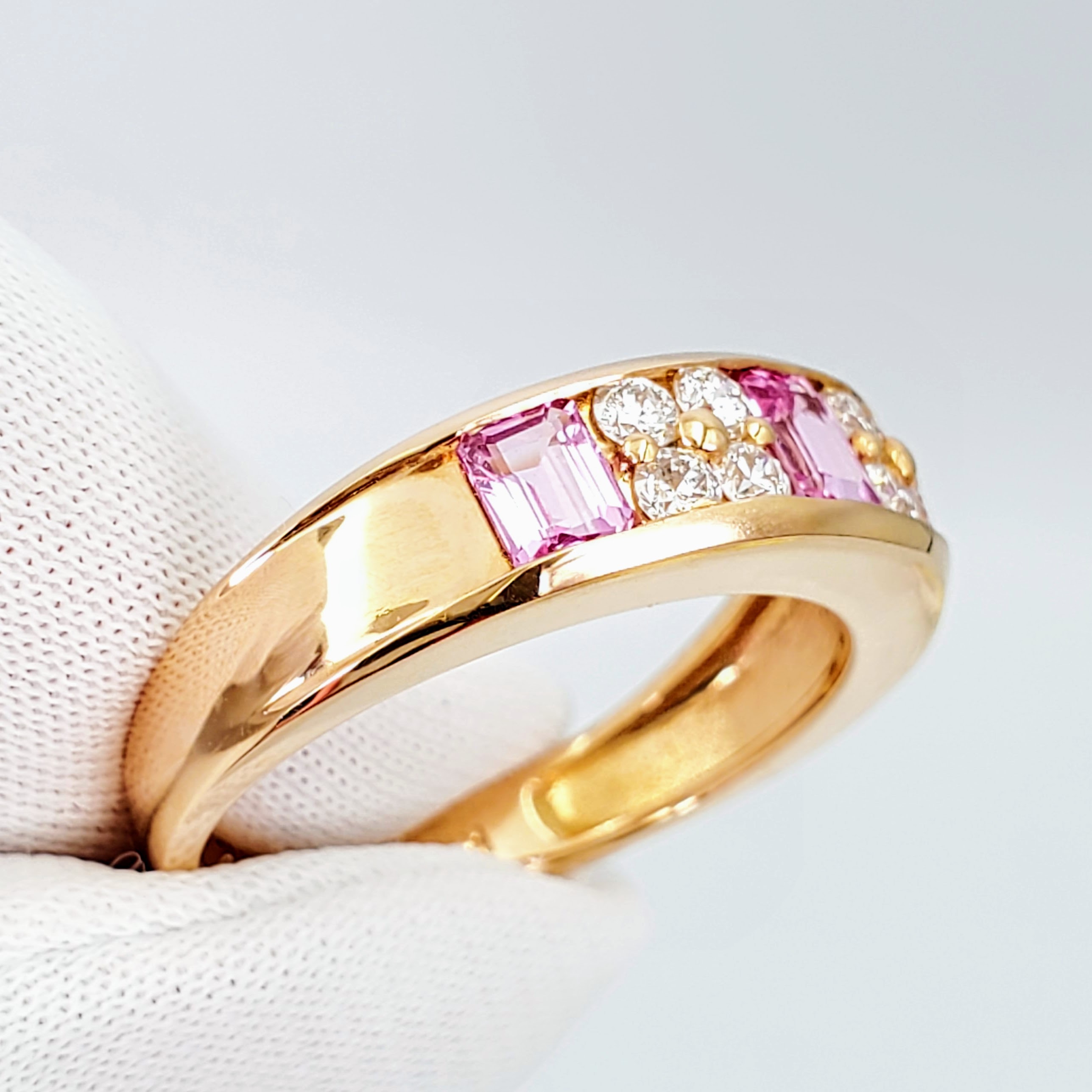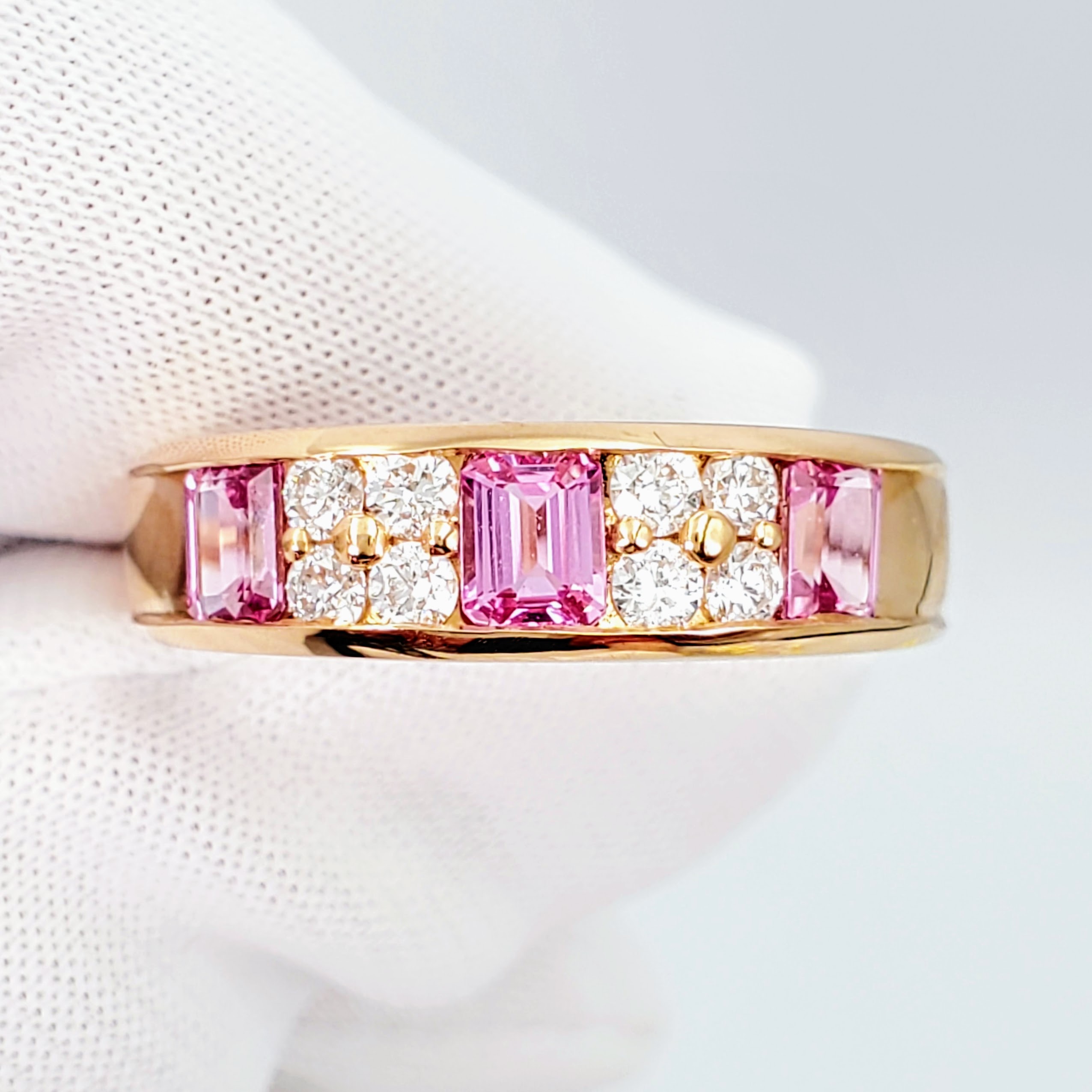 バゲットカットのピンクサファイアが澄んだ発色で手元を彩り、ダイヤモンドの輝きがその美しさを引き立てます。