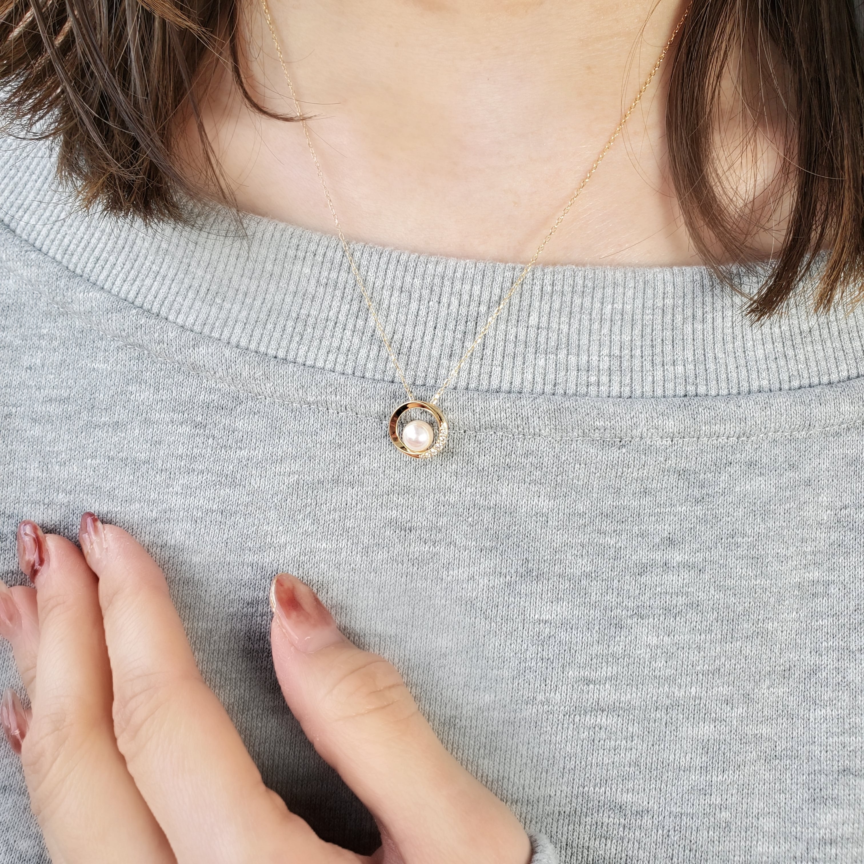 シンプルながら立体感があり胸元でパールがふわっと浮かび上がるようなデザインは、動くたびに柔らかな輝きを放ちます。