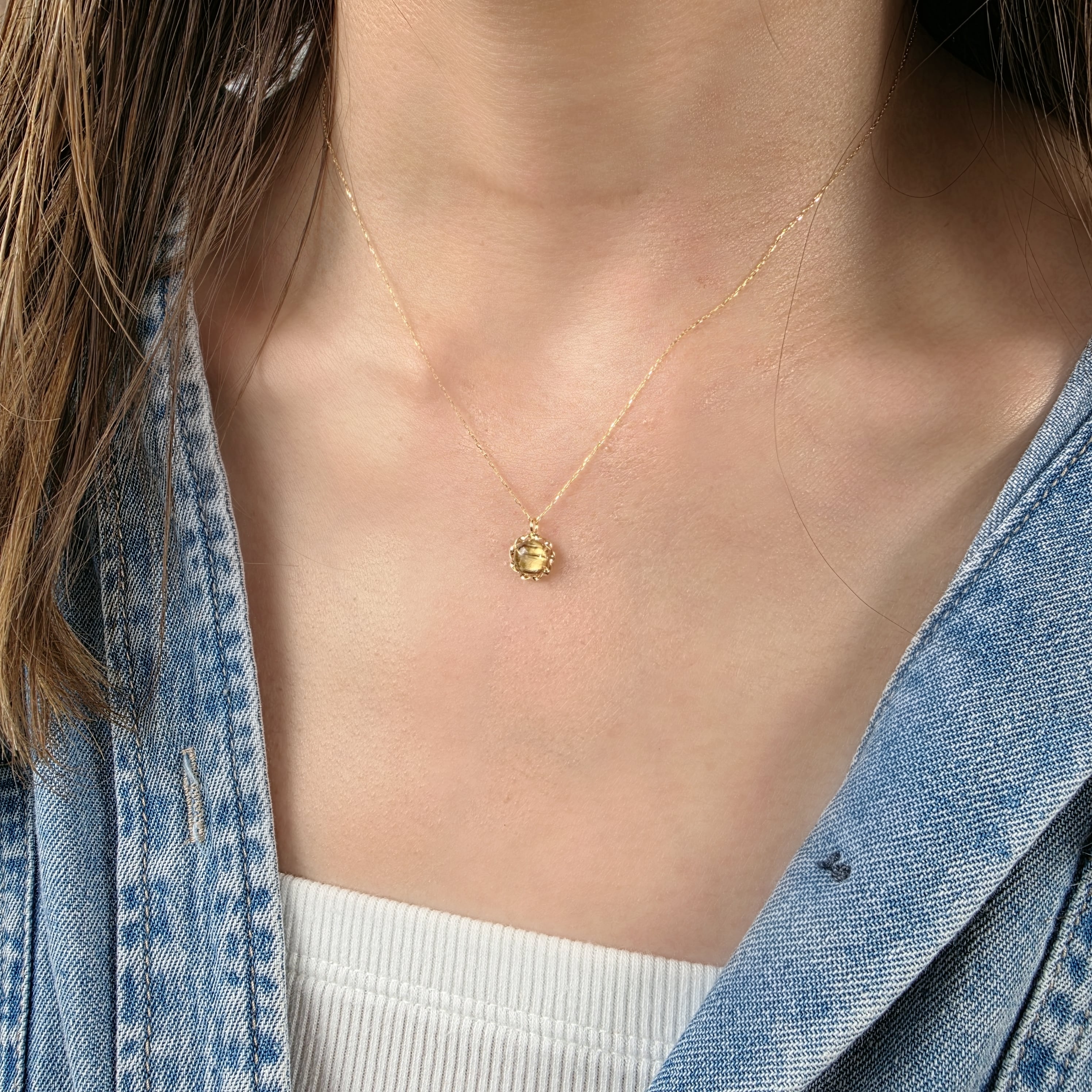 太陽の光を思わせる穏やかな色合いが、胸元にぬくもりを感じさせる仕上がりに。