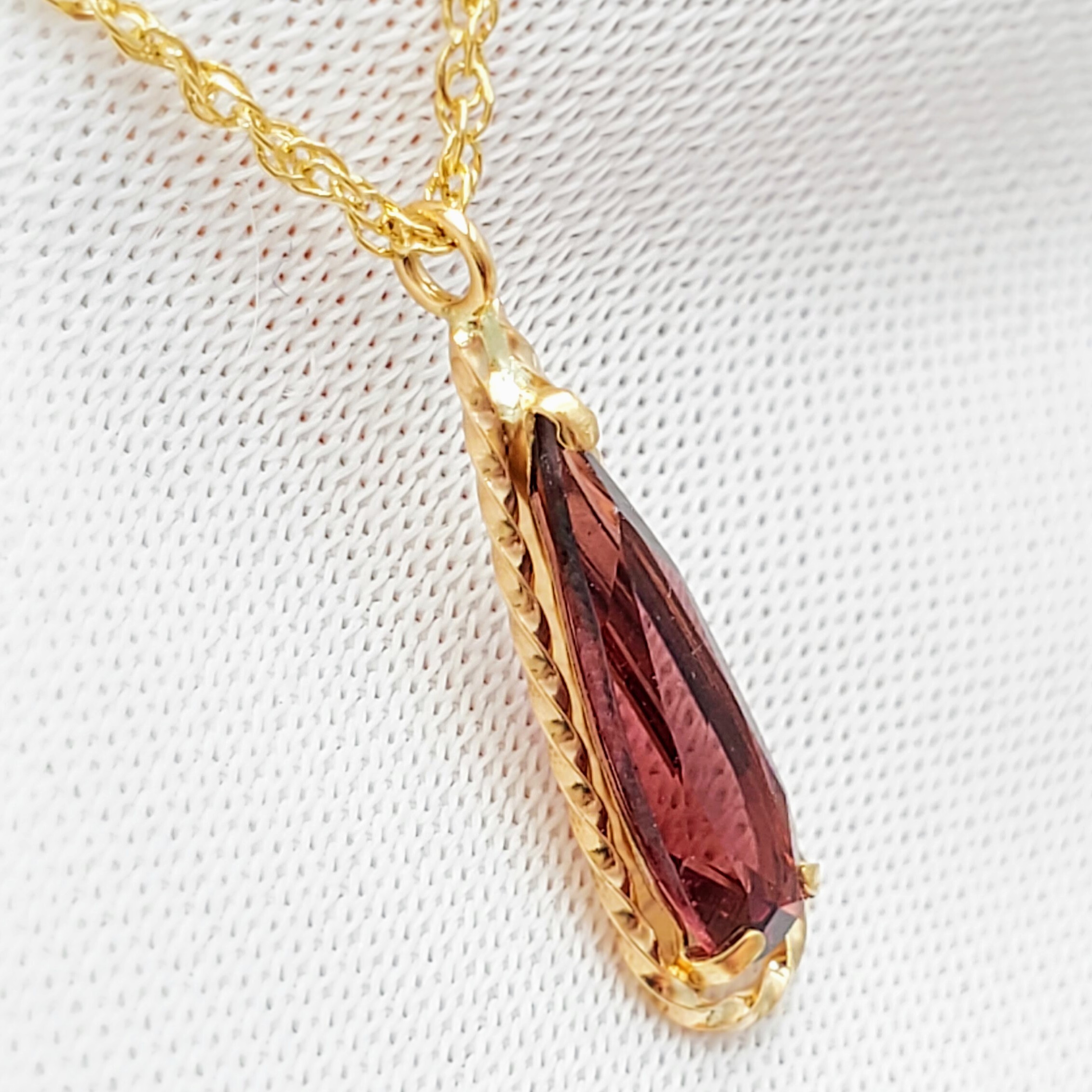 イエローゴールドの優しい輝きがガーネットの深い色味を引き立て、胸元に落ち着いた華やかさを添えます。