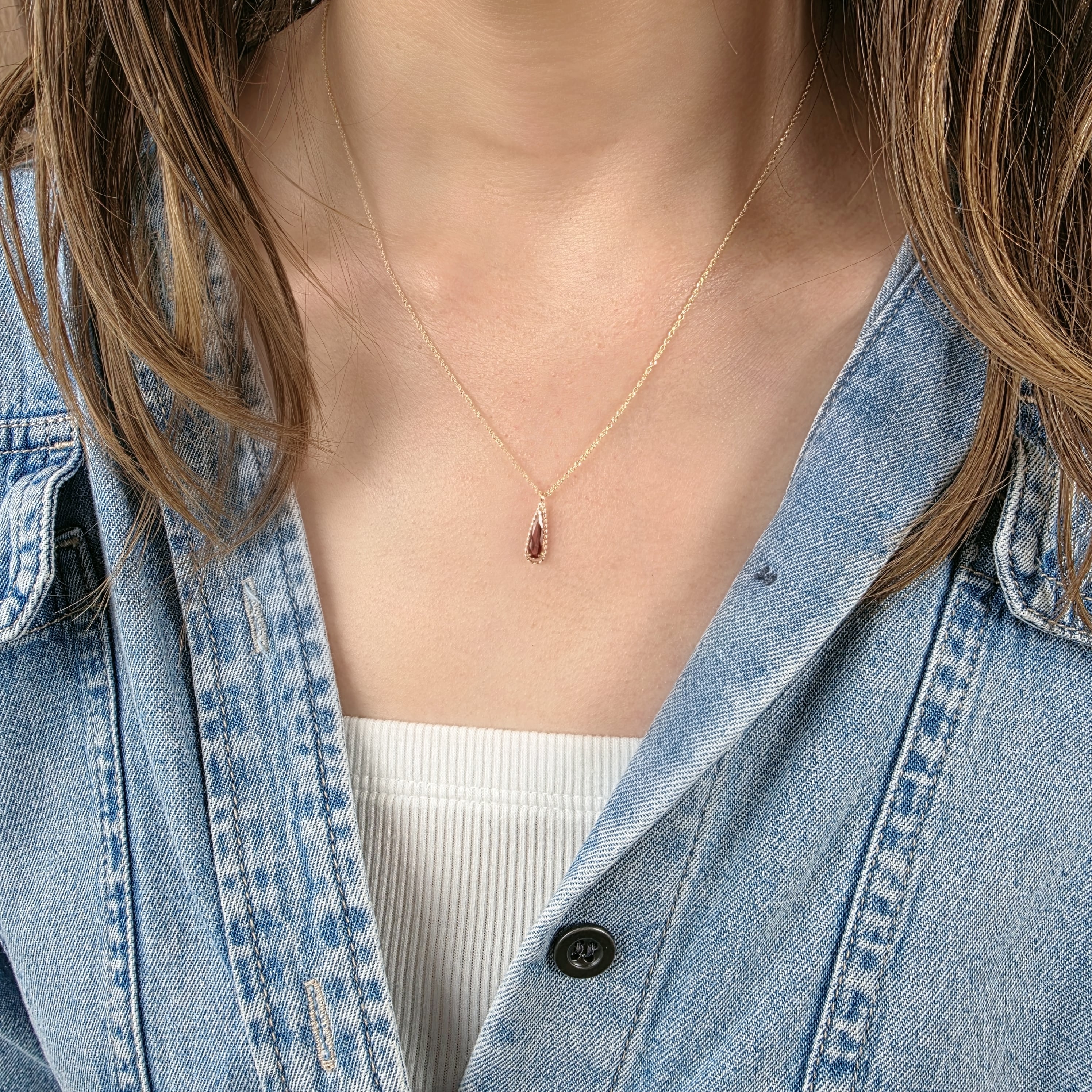 気品ある赤が美しいガーネットを、シャープなしずく型にカットして仕立てた本作。