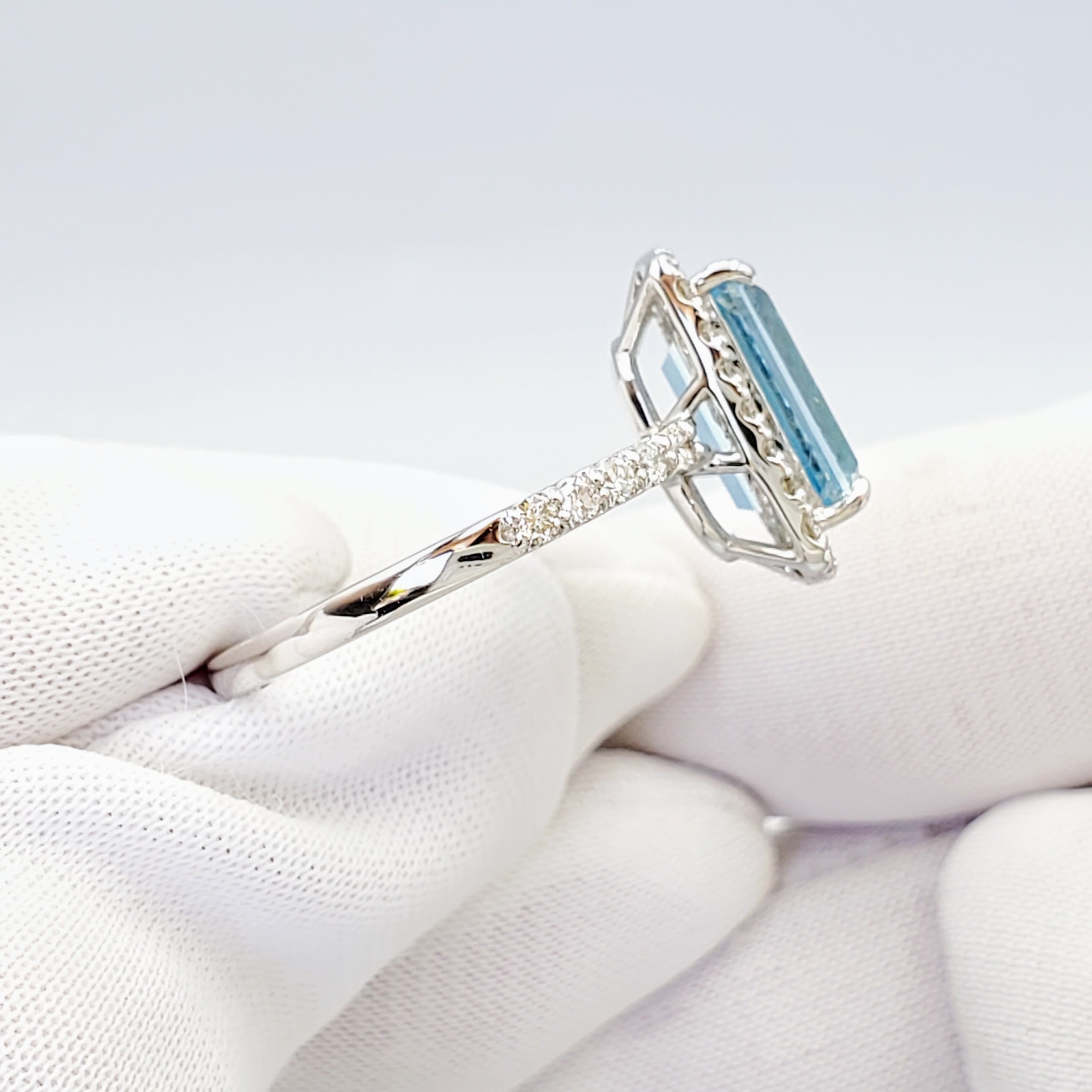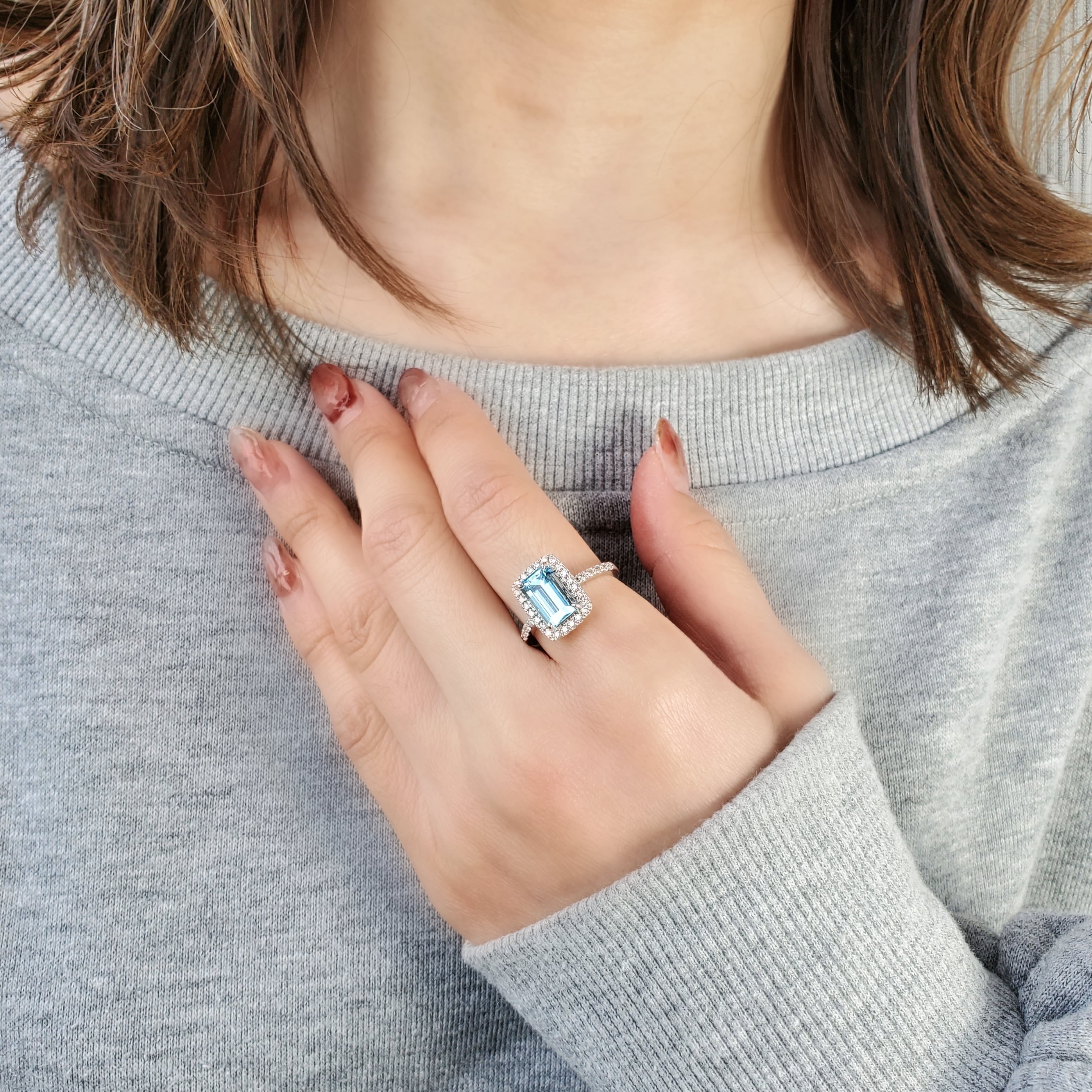 カットの美しさと、細やかに並んだダイヤモンドのアーム、そしてアクアマリンが持つ凛とした輝きが調和し、ボリュームがありながらも自然に手元になじむ、優しい印象に仕上げています。