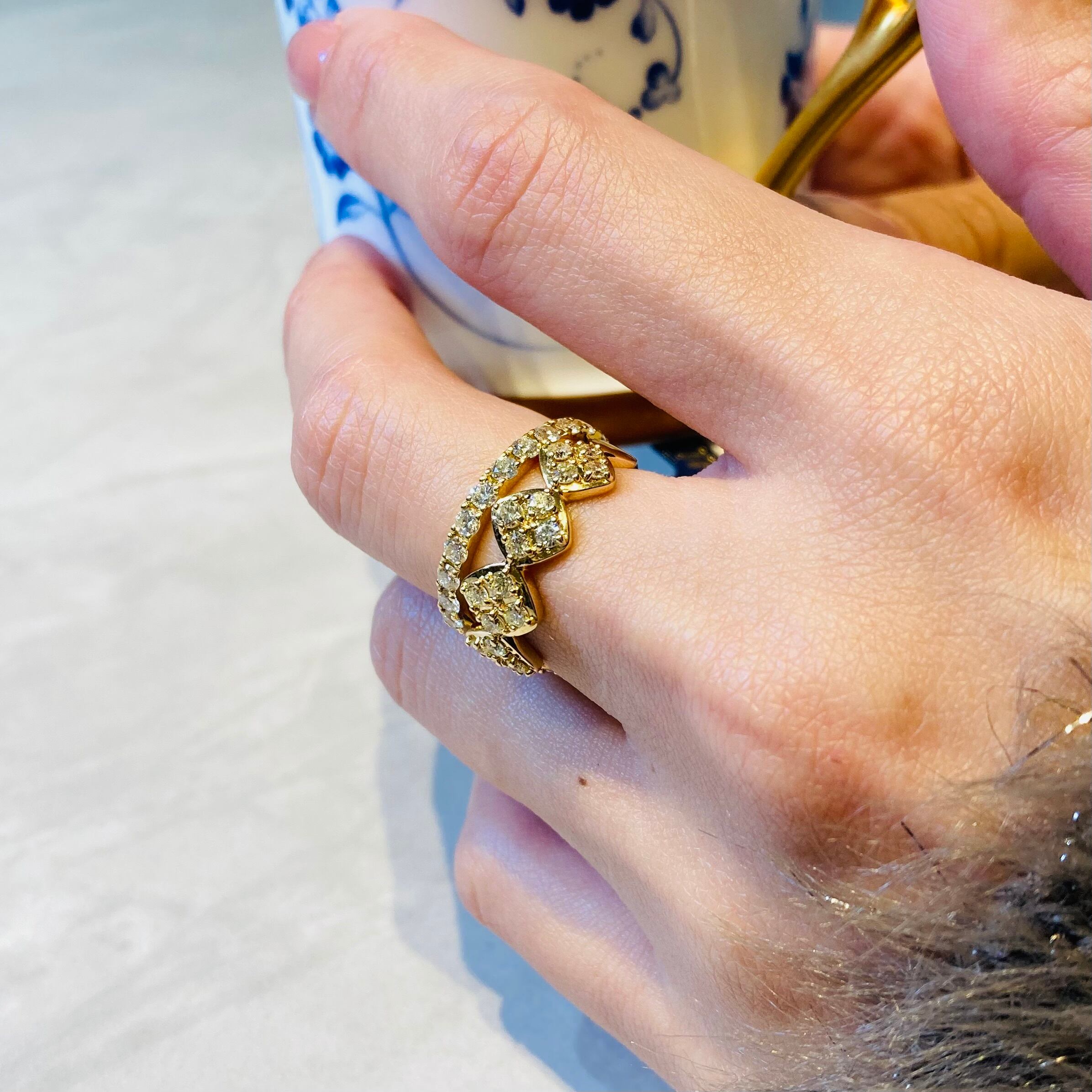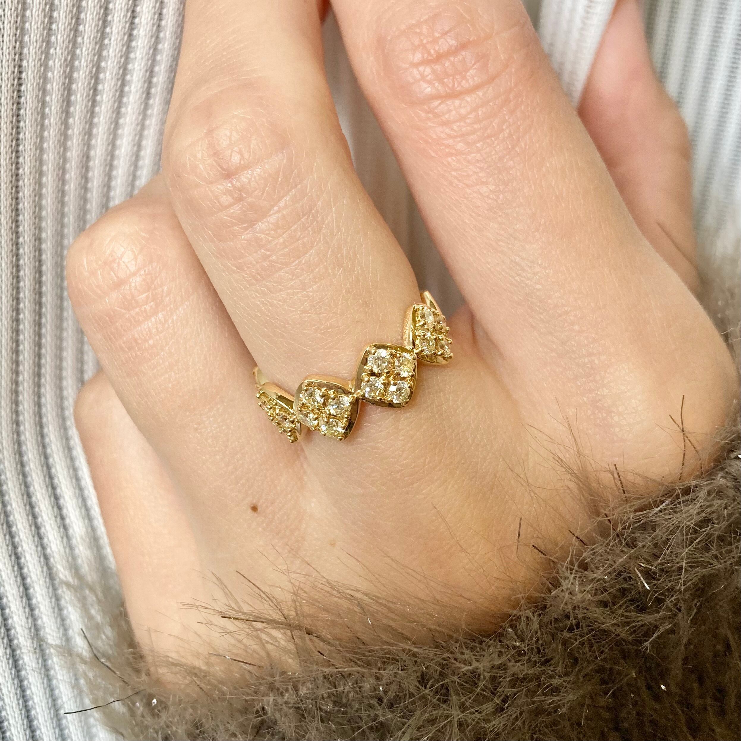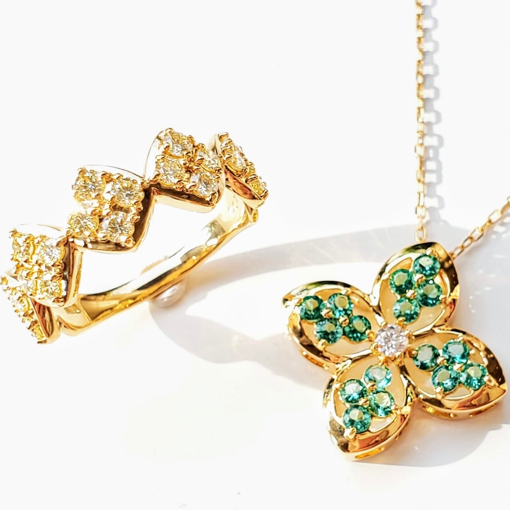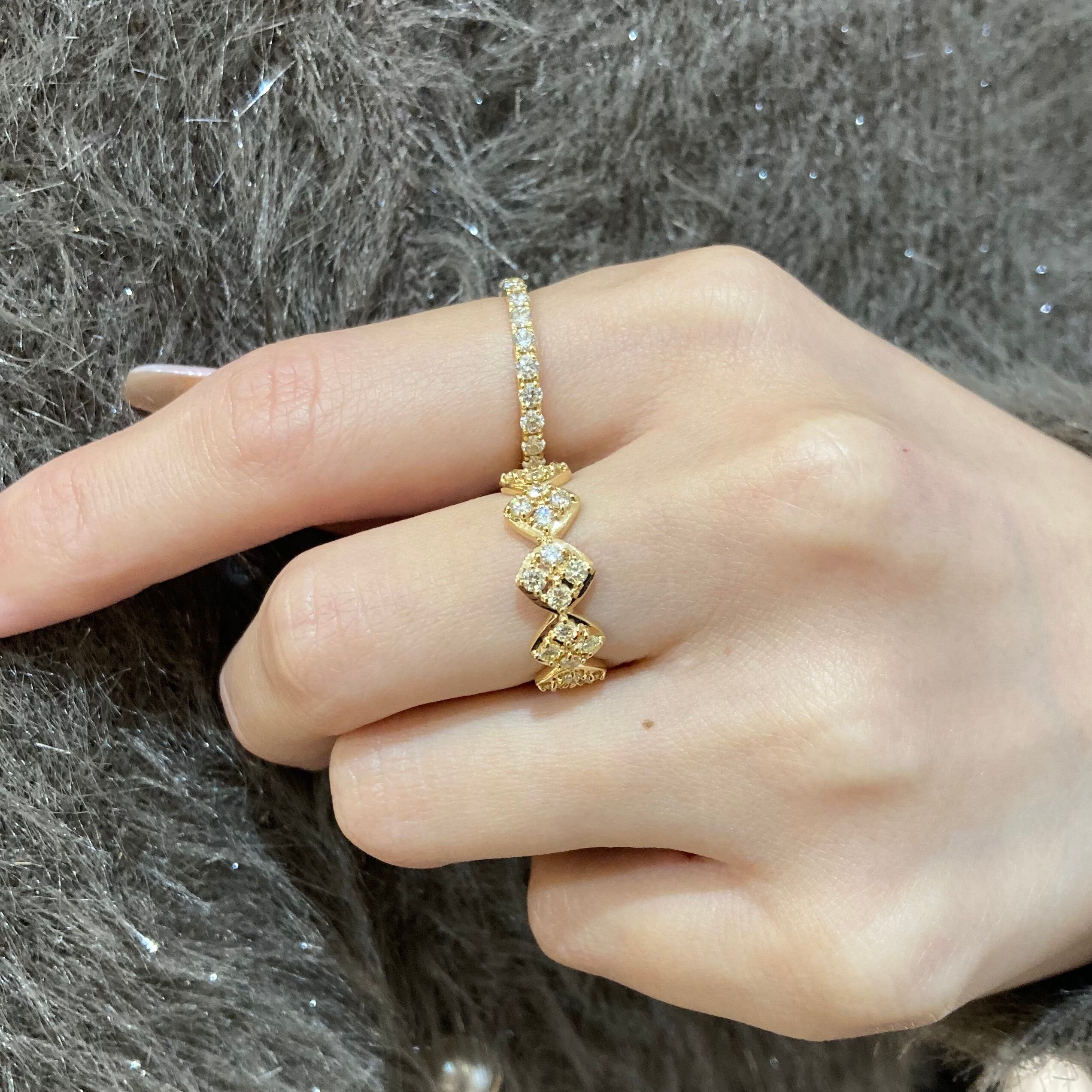 均等に並んだモチーフがリズムを生み、ゴールドの柔らかな光がダイヤの輝きを上品に見せる仕上がりに。