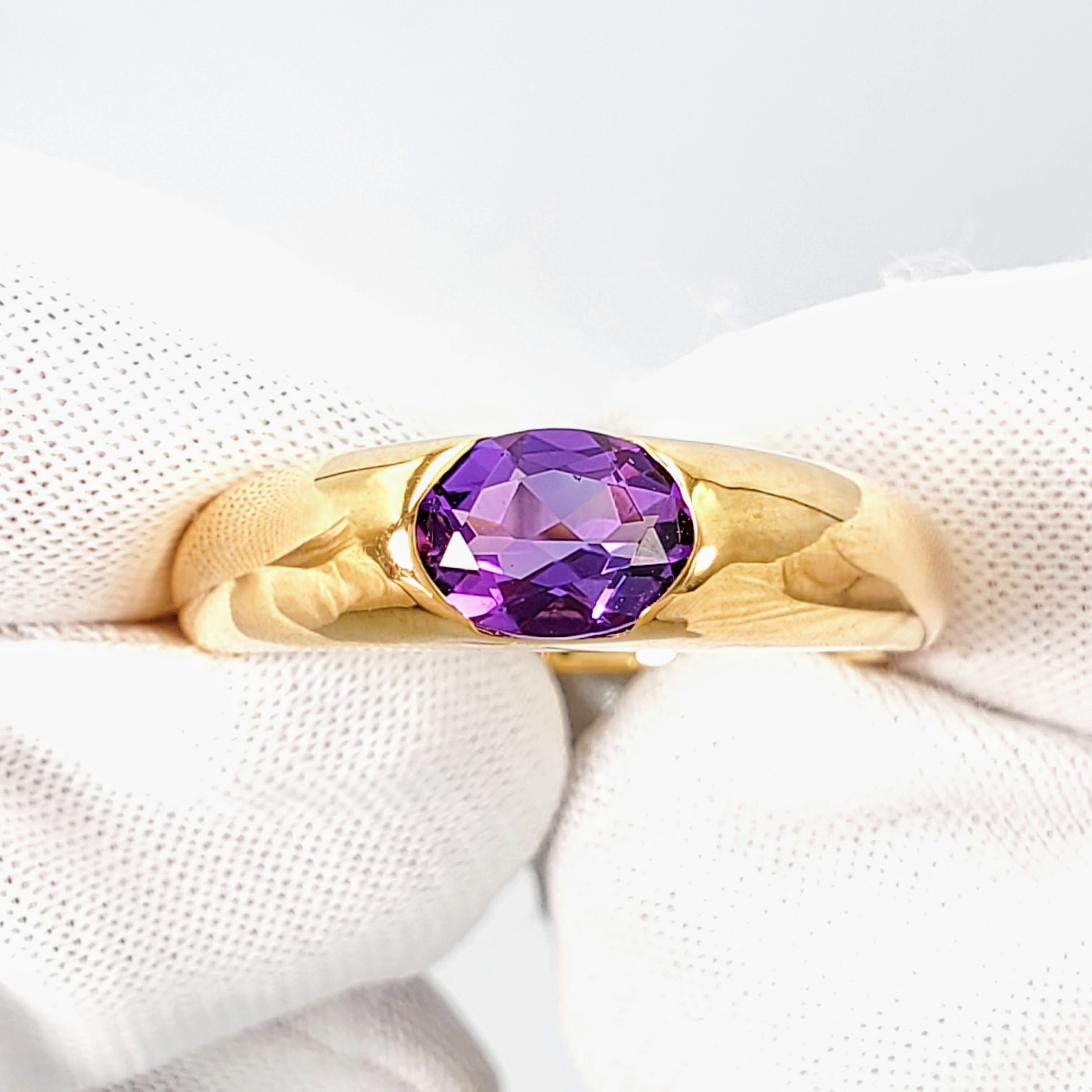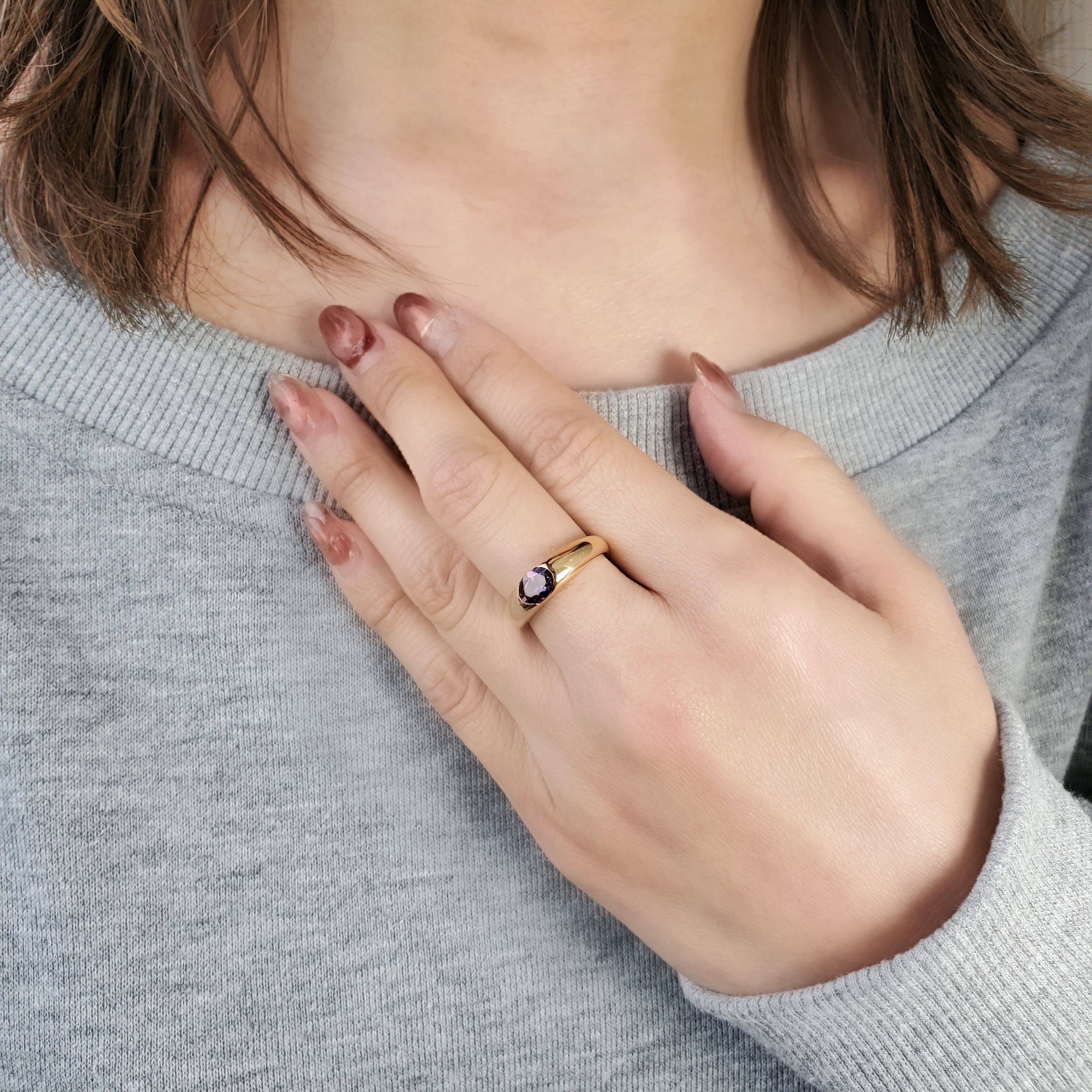ゴールドと紫の組み合わせは、少し上級者向けの印象がありますが、このリングは不思議とすっと馴染むシンプルさがあって、とてもおしゃれに感じました。