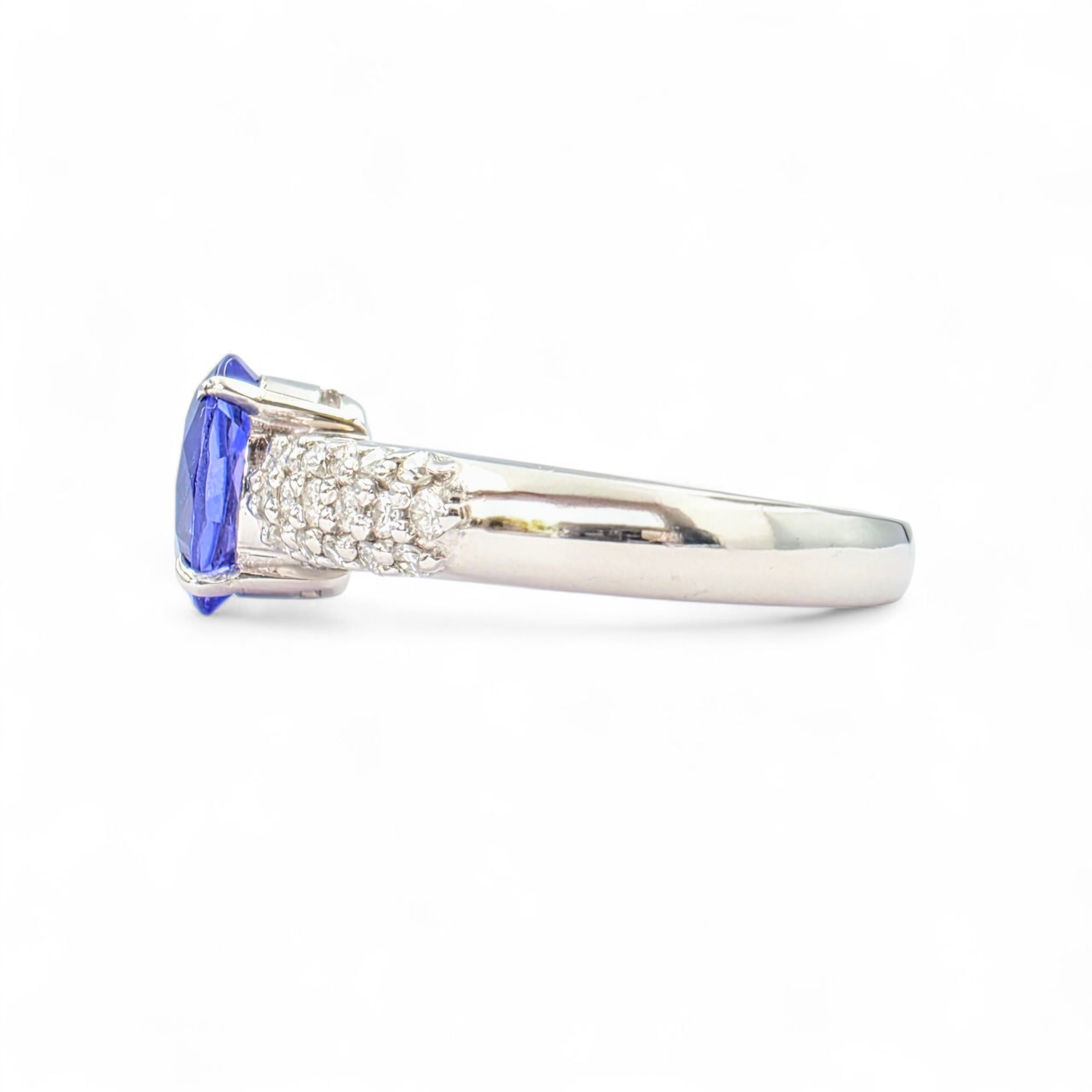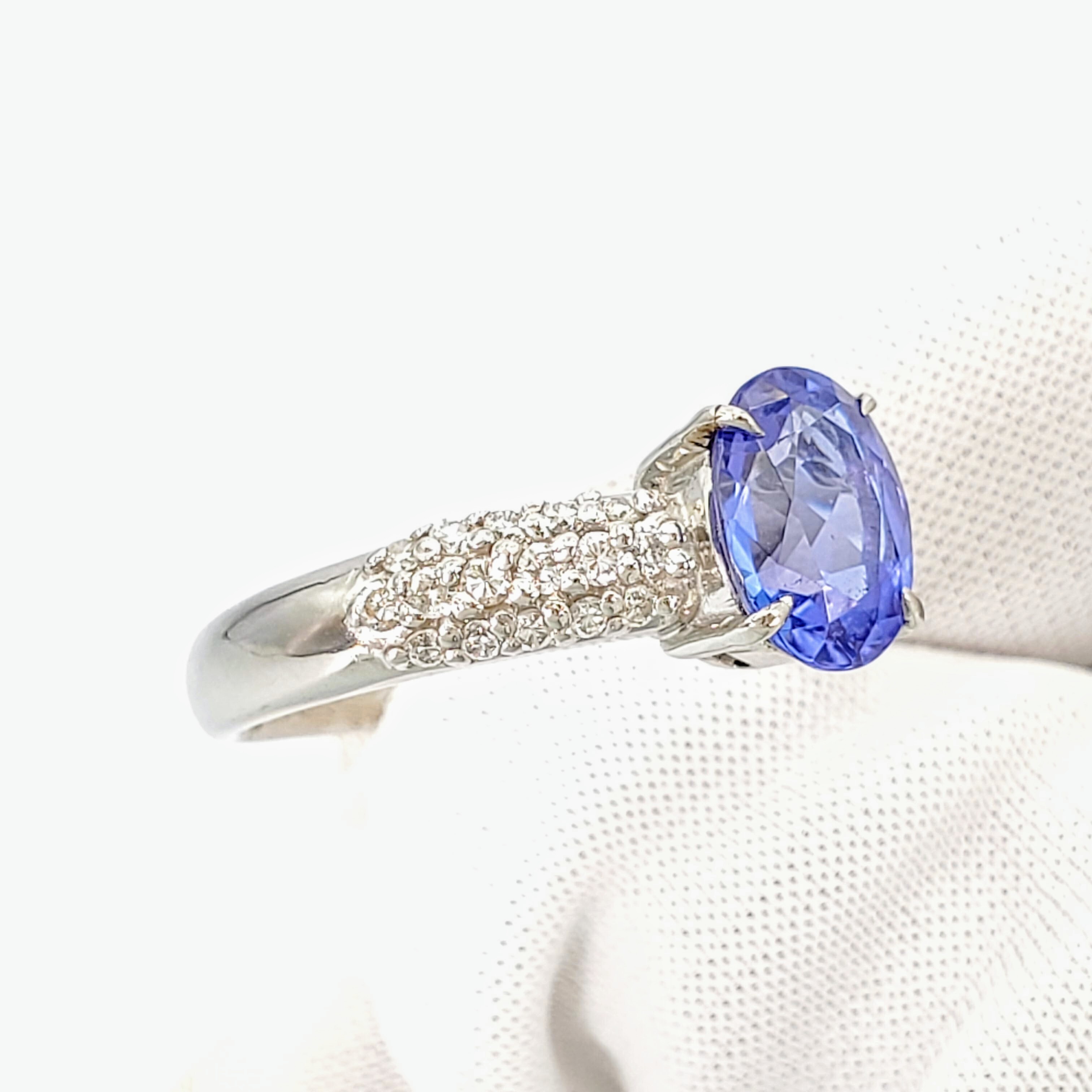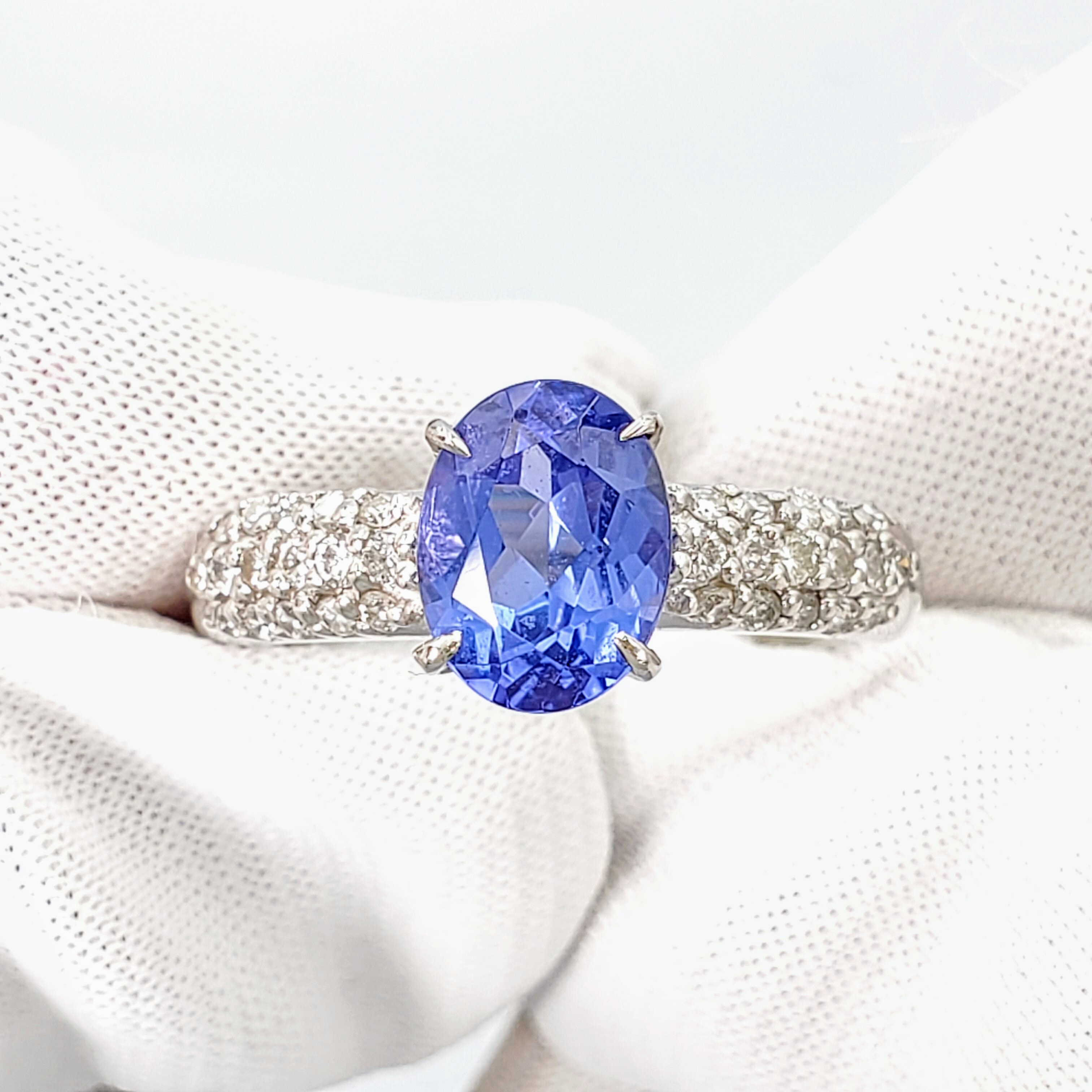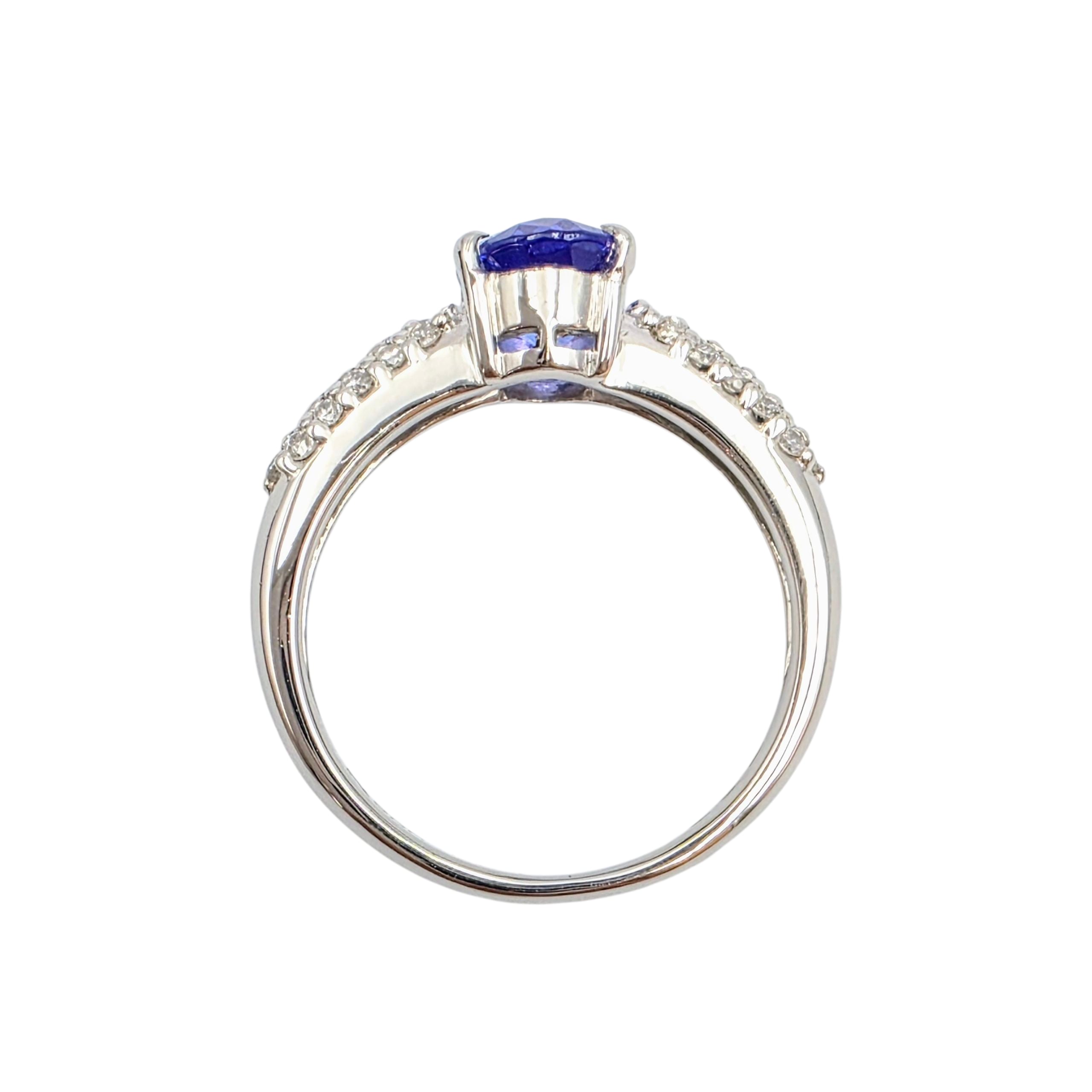 光の角度で青紫が揺らぐタンザナイトを主役に、アームには繊細なダイヤモンドを敷き詰め、上品な輝きを添える仕上がりに。