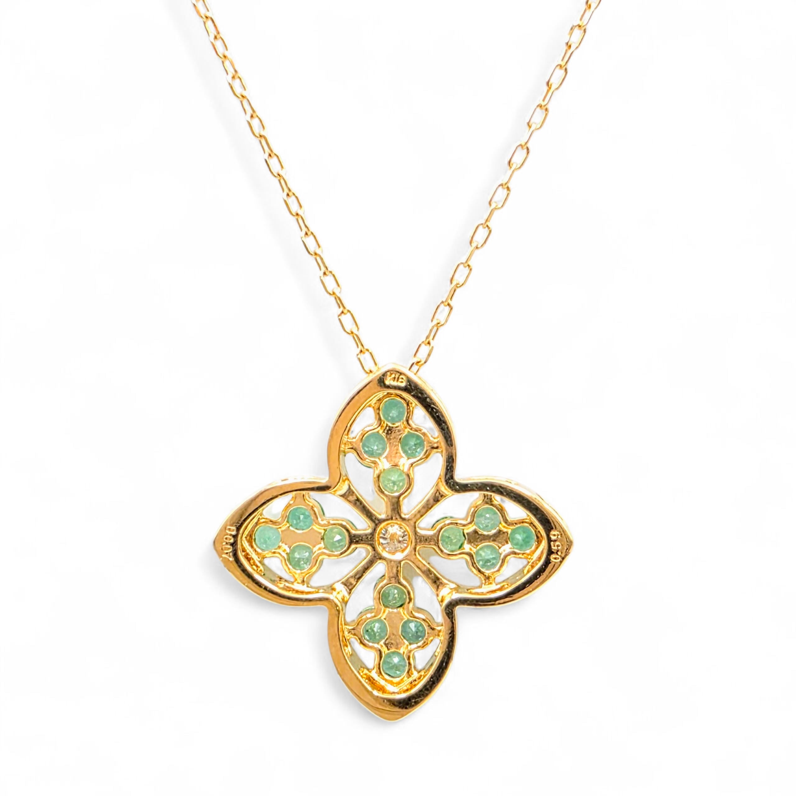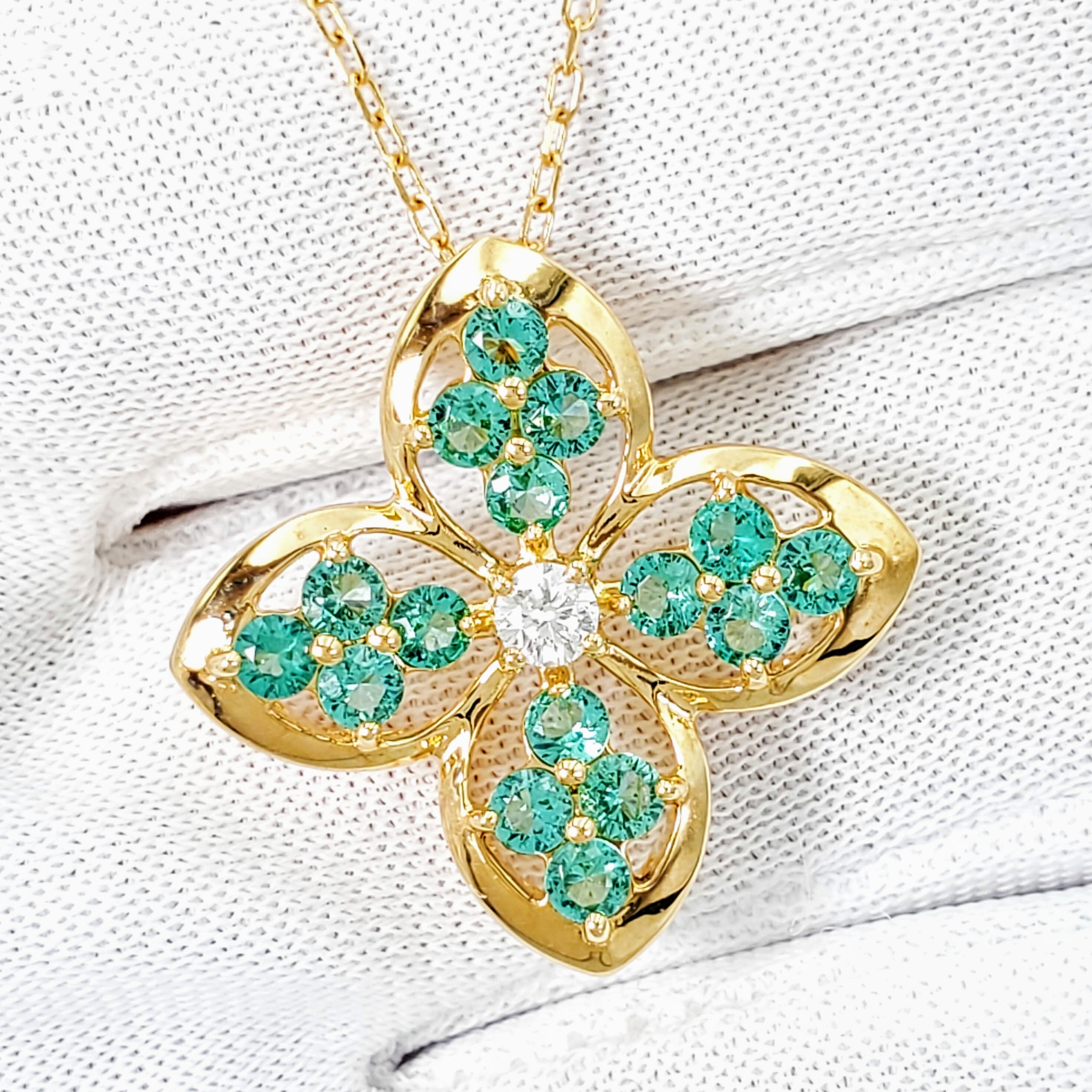 花びらの形に沿って丁寧にセットされたグリーンの輝きが、ゴールドの温かみと重なり合い、胸元で鮮やかな存在感を放ちます。