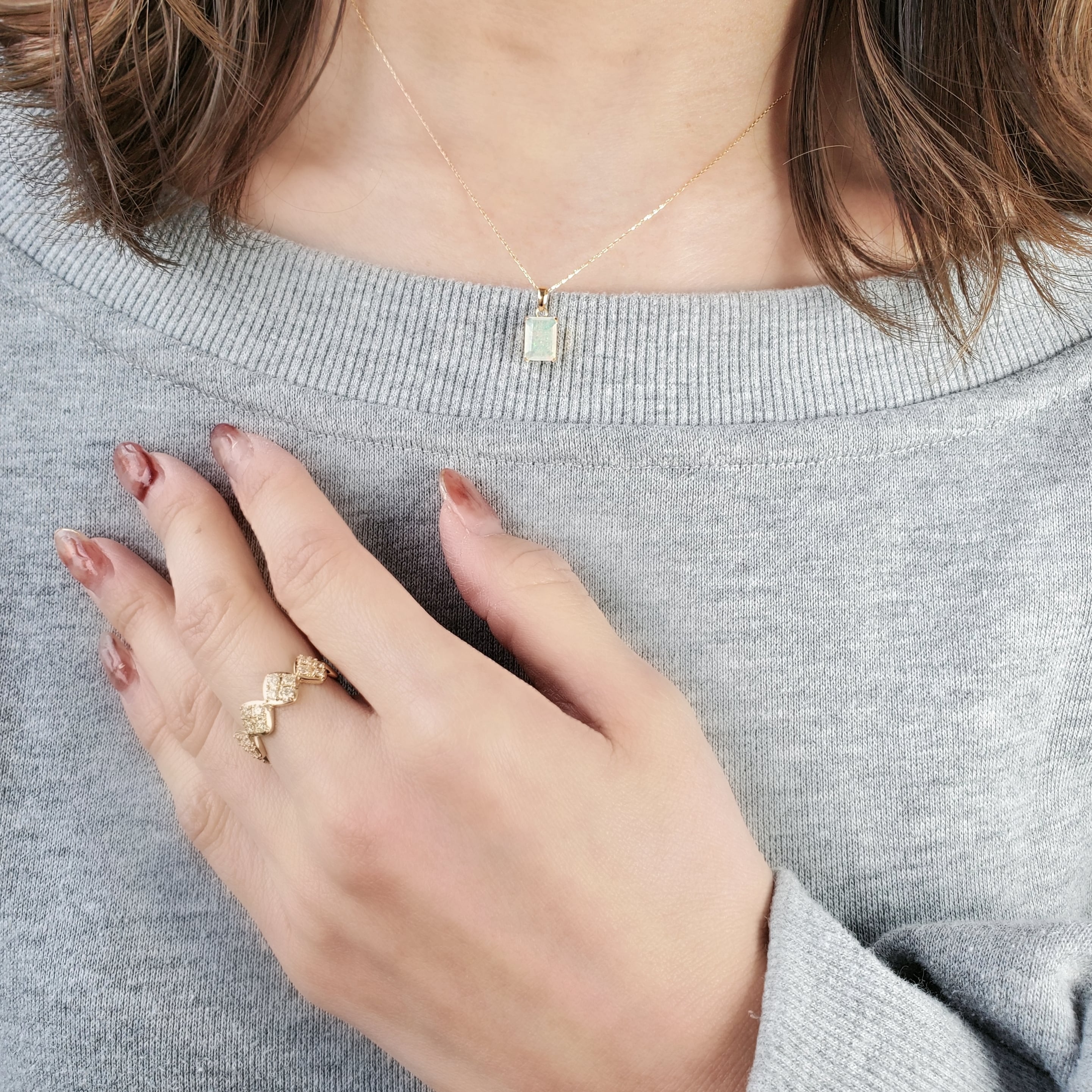 オパールを四角いフォルムにカットしているデザインは意外と珍しく、その特別感にまず惹かれました。