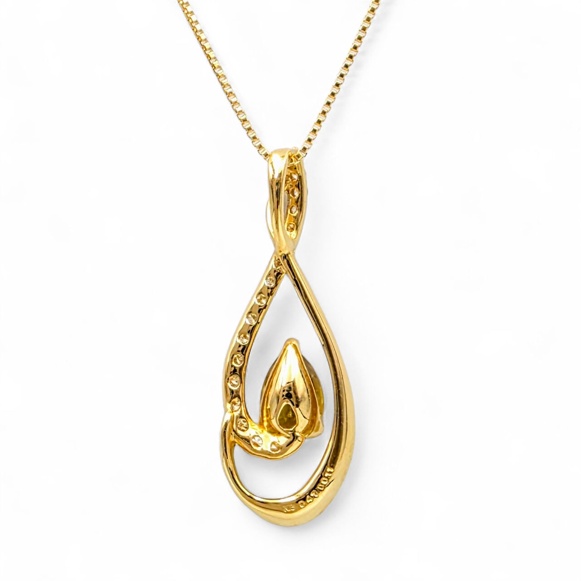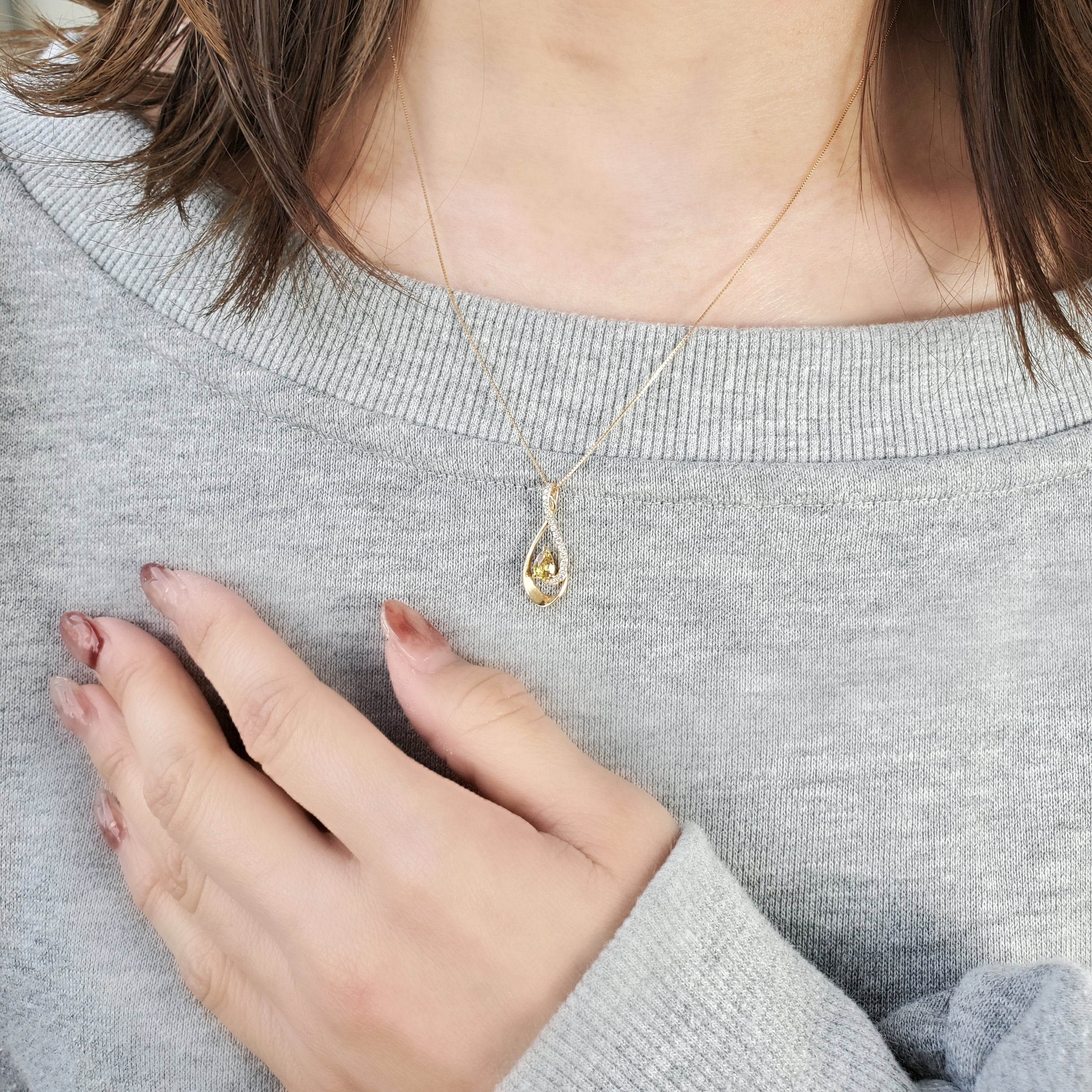 イエローゴールドの流れるようなラインが宝石をやわらかく包み込み、胸元に優しい明るさを添えています。