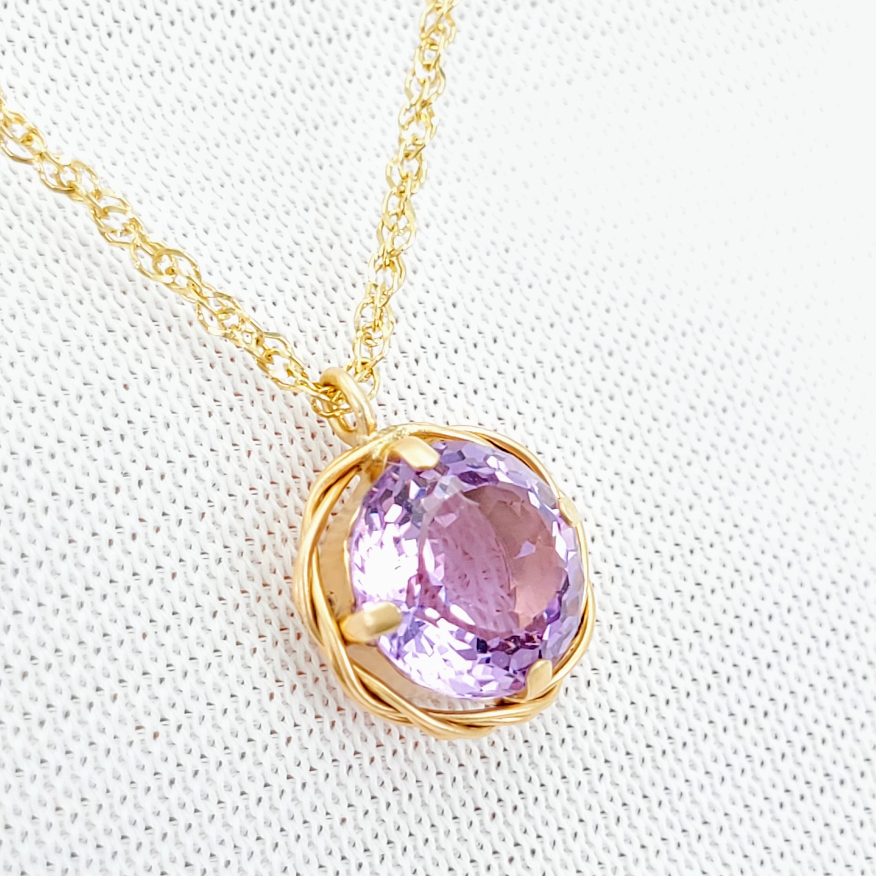 透明感のあるアメシストを、ゴールドでやわらかく包み込むように仕立てた本作。