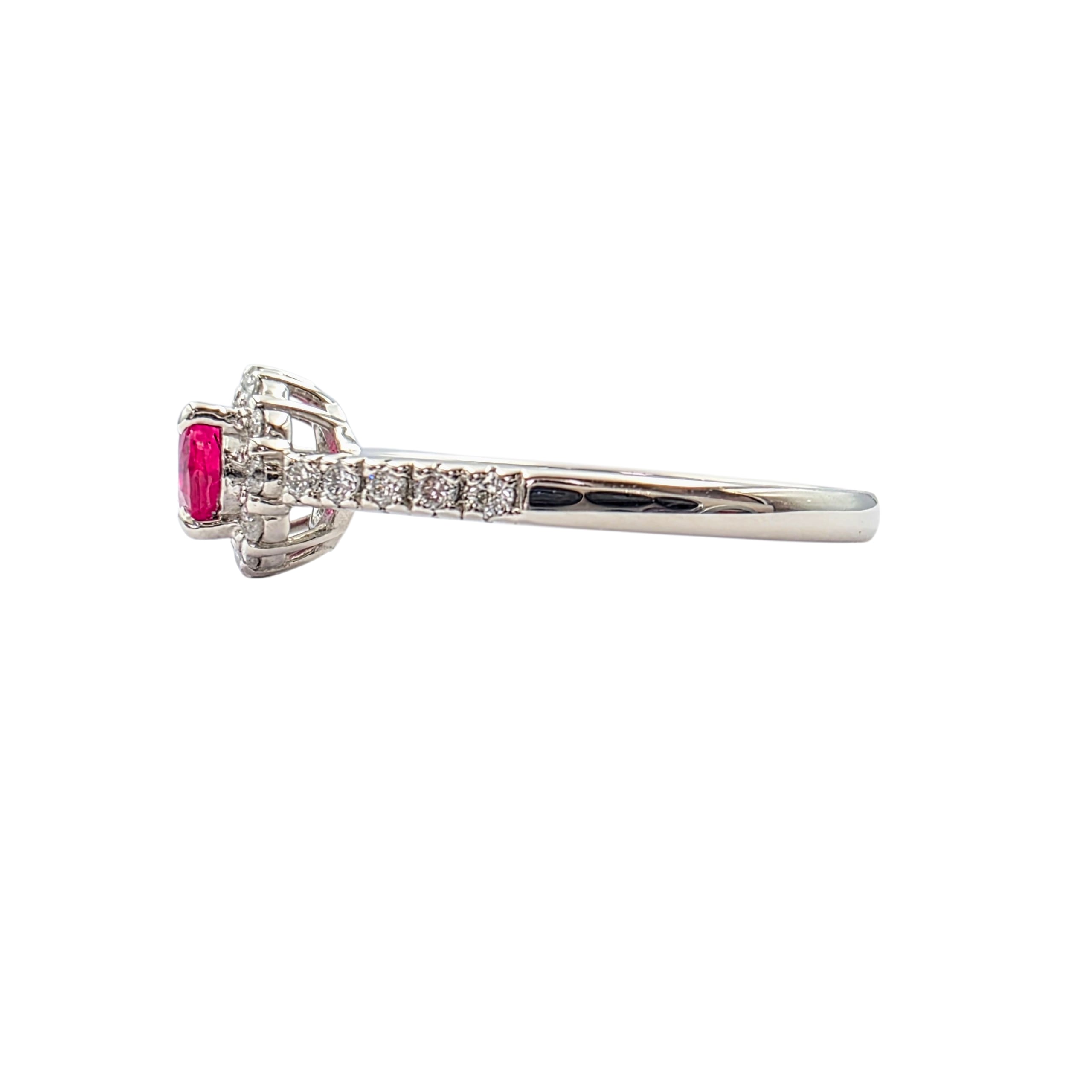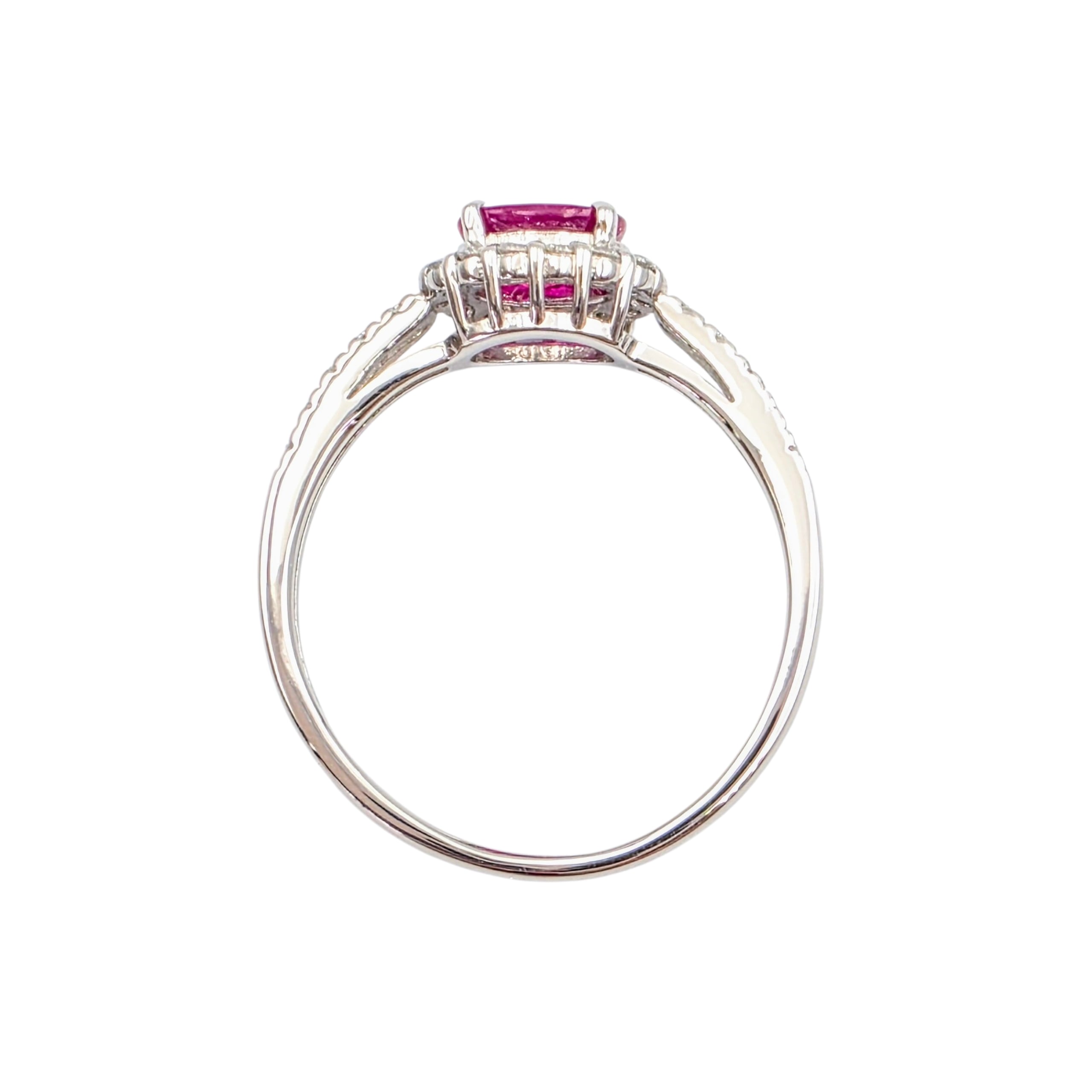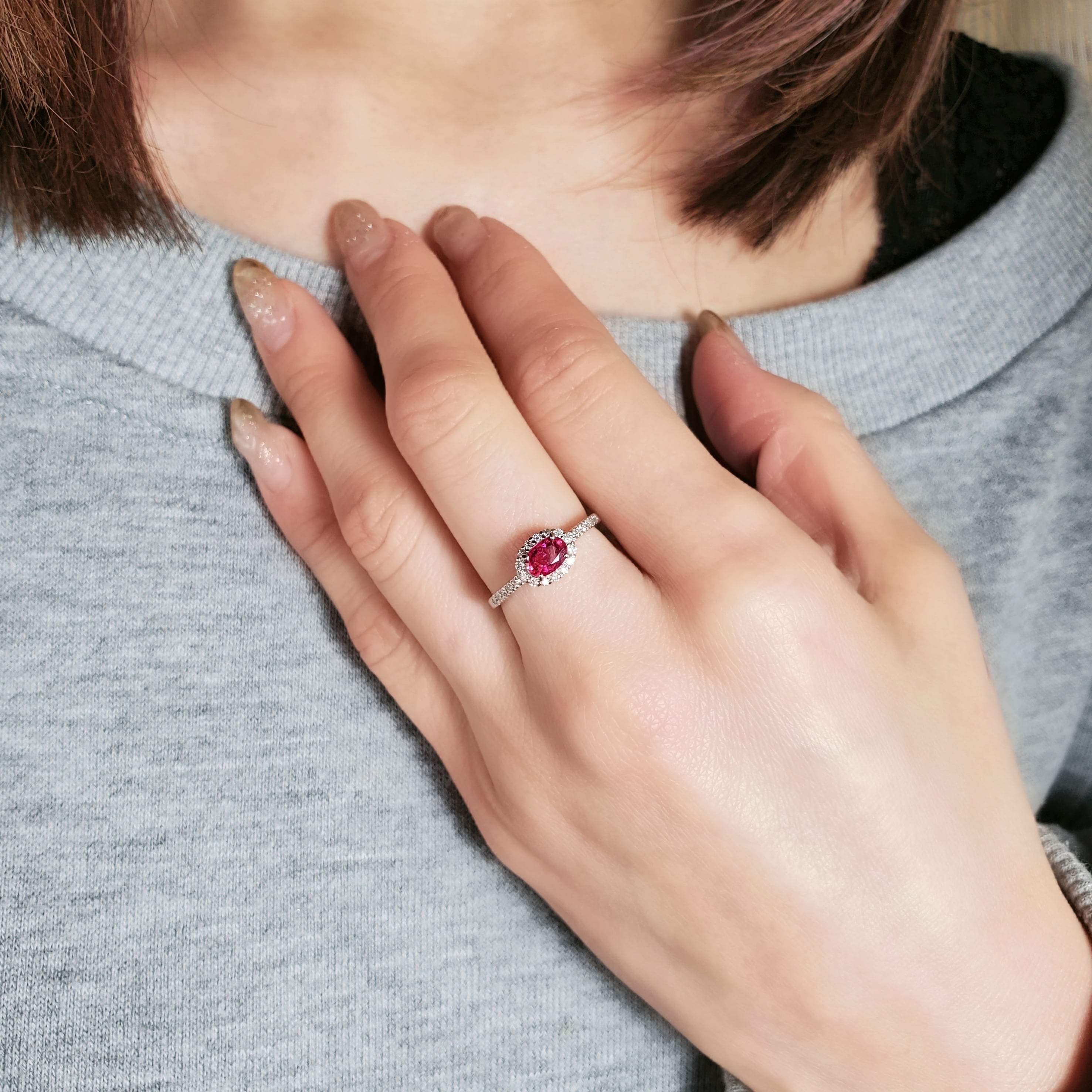 周りを取り巻くダイヤモンドが、ルビーの色彩を引き立てながら、全体に上品なきらめきをプラスしています。