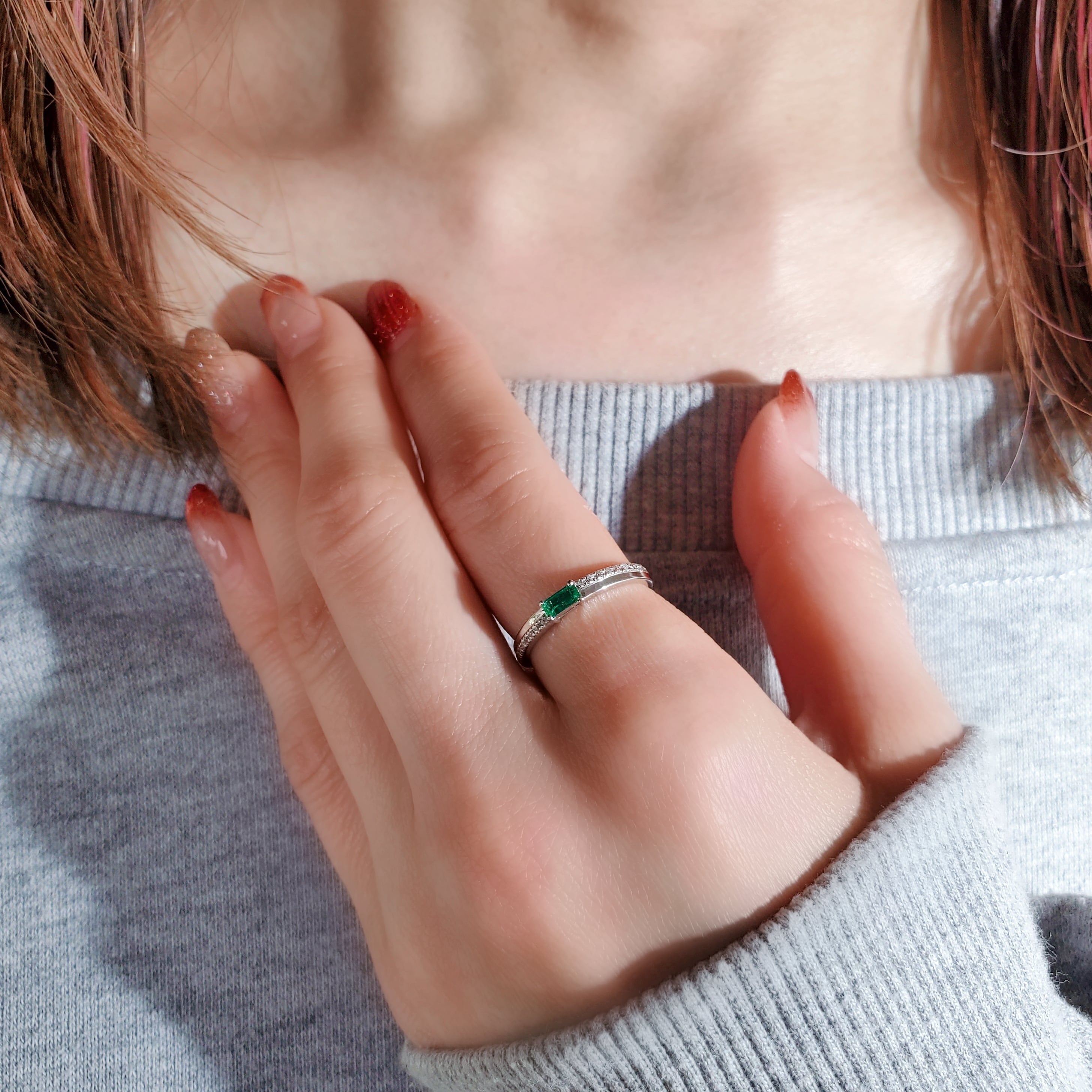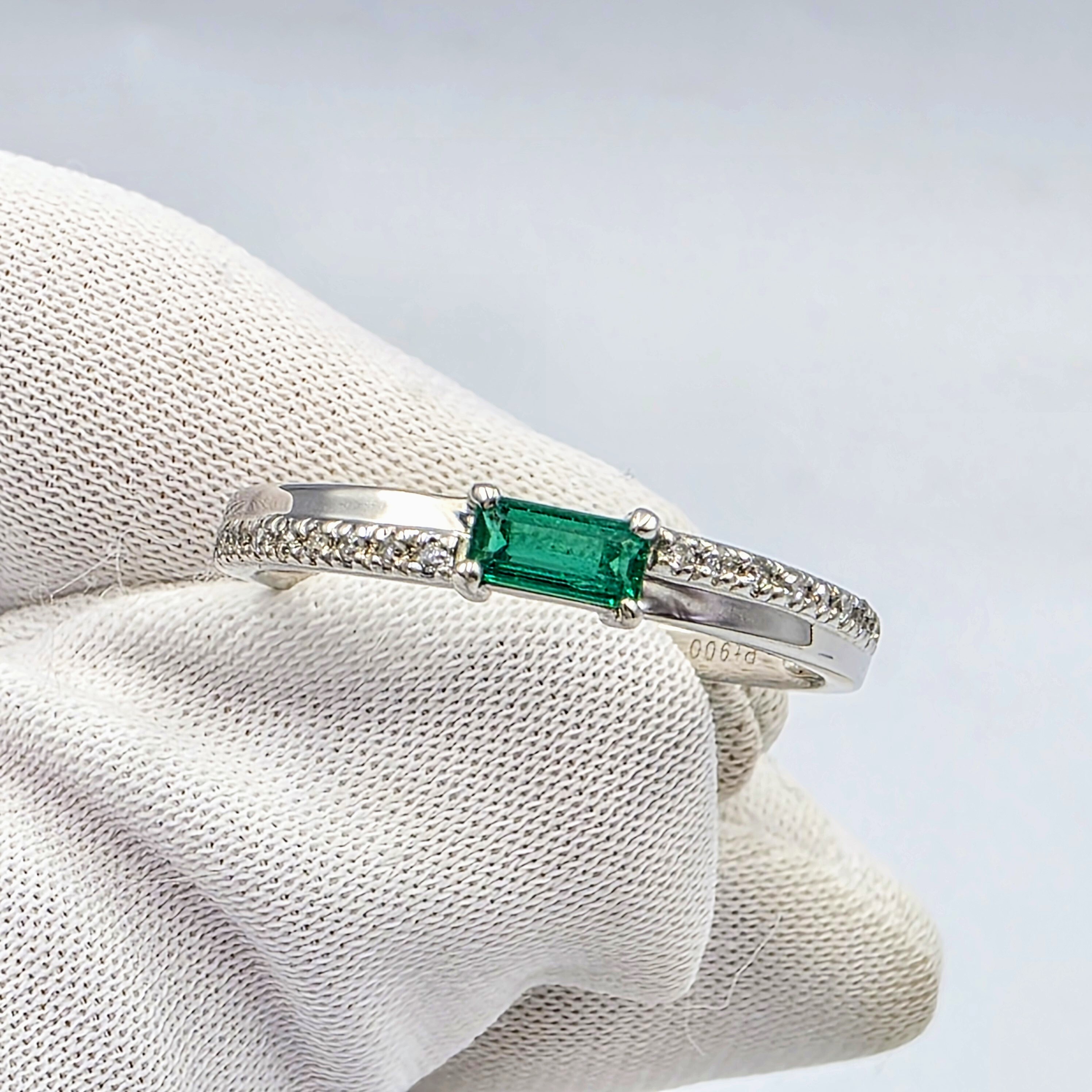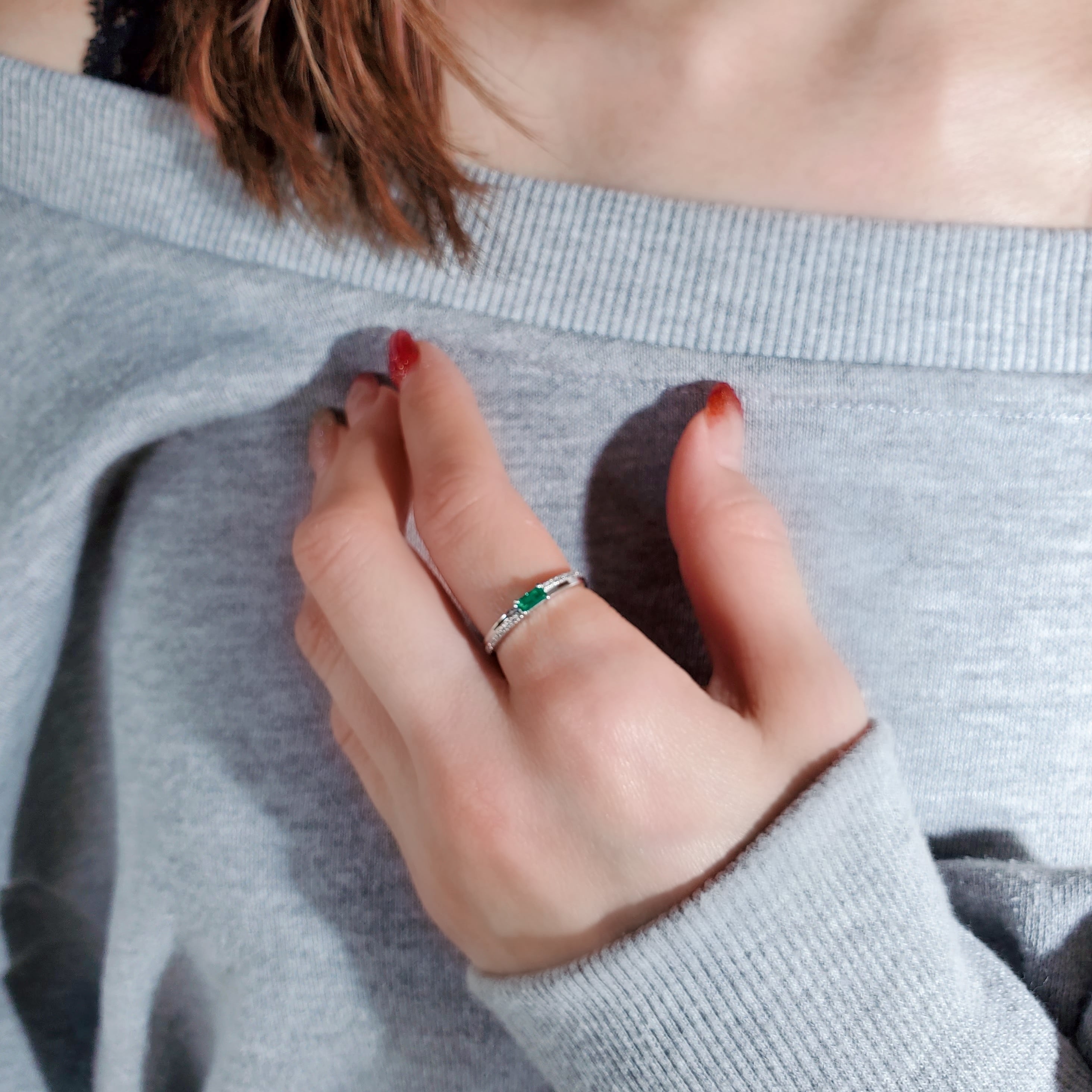 素材:Pt900、エメラルド0.13ct(縦約2mm・横約4.5mm)、ダイヤモンド0.08ct