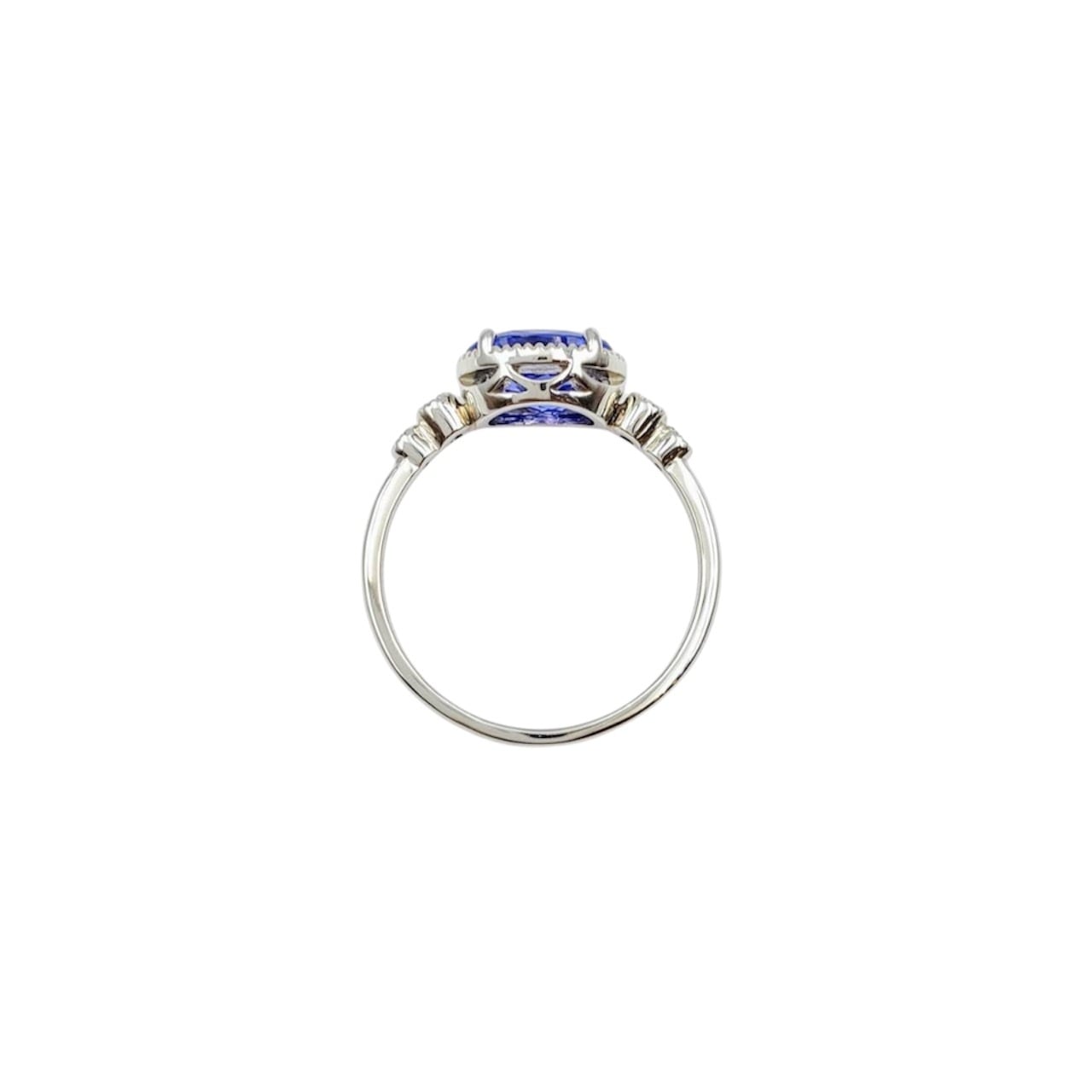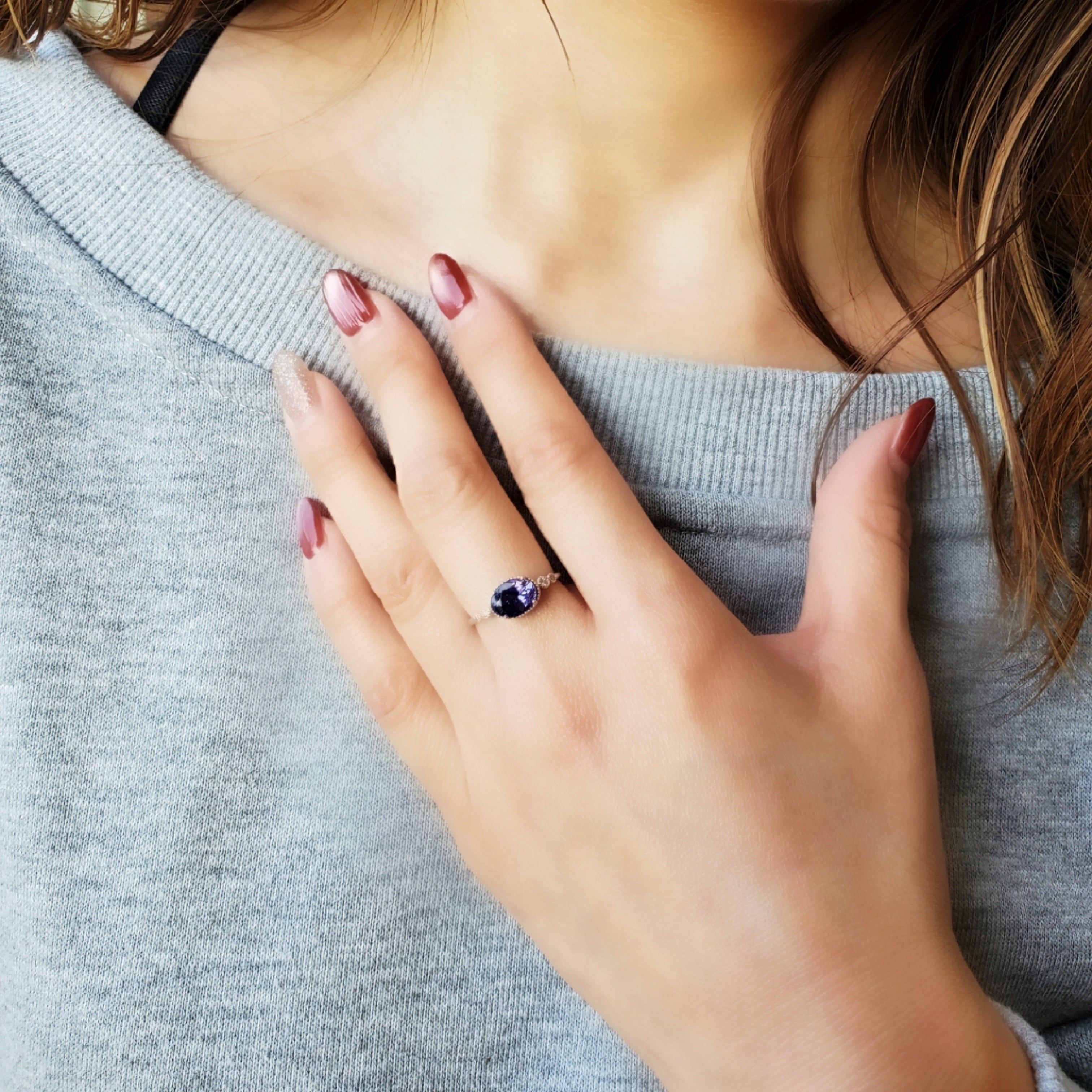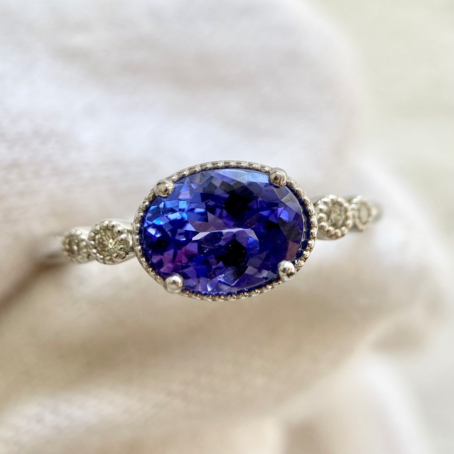 両サイドに添えられたダイヤモンドがタンザナイトの神秘的な色彩を引き立て、まるで夜空に輝く星のようなきらめきを添えています。